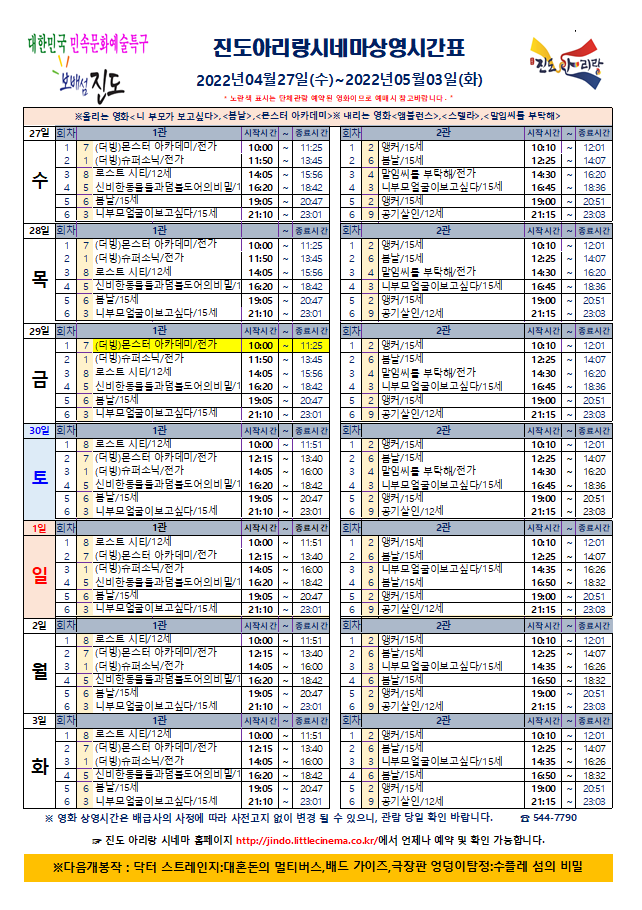 진도아리랑시네마 상영시간표<2022.04.27(수)~05.03(화)> 안내드립니다.