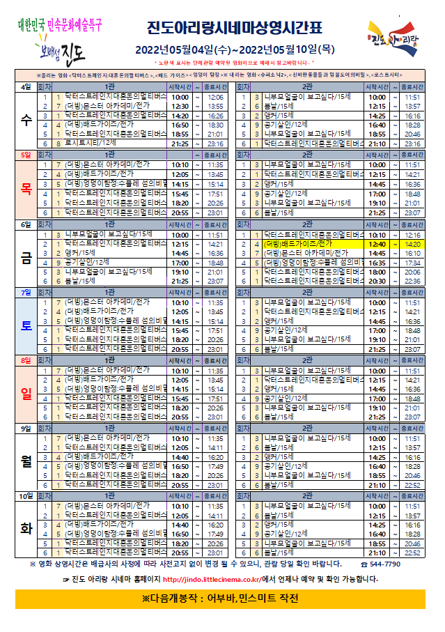 진도아리랑시네마 상영시간표<2022.05.04(수)~05.10(화)> 안내드립니다.