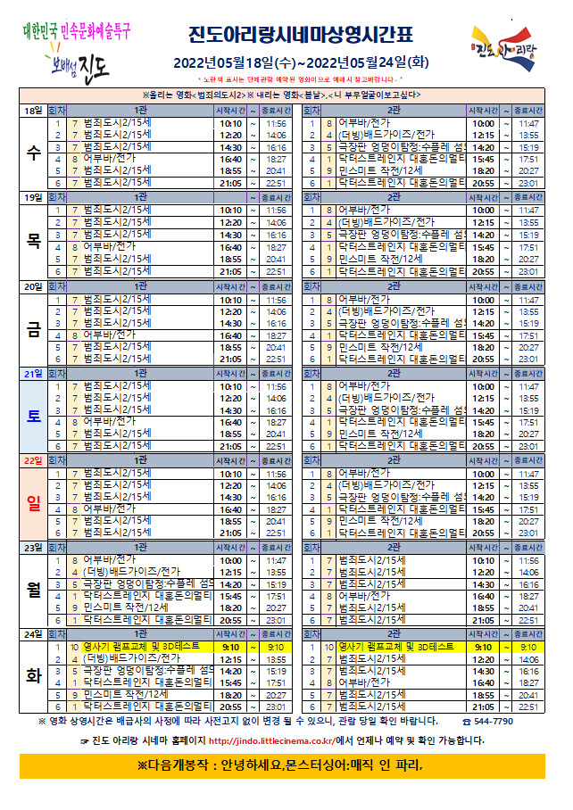 진도아리랑시넴 상영시간표<2022.05.18(수)~05.24(화)> 안내드립니다