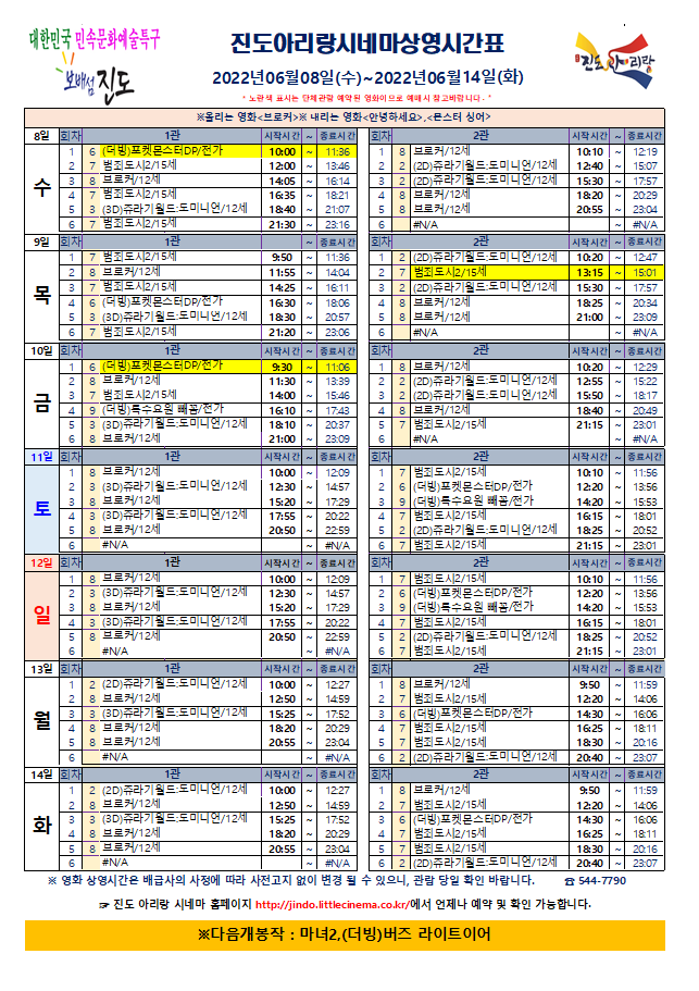 진도아리랑시네마 상영시간표<2022.06.01(수)~06.07(화)> 안내드립니다.