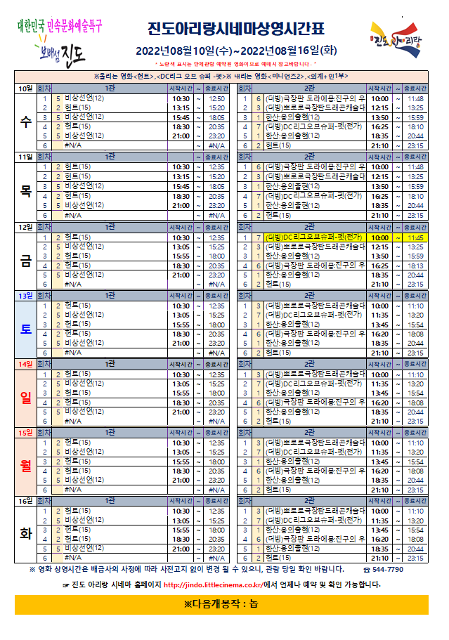 진도아리랑시네마 상영시간표 <2022.08.10(수)~08.16(화)> 안내드립니다.