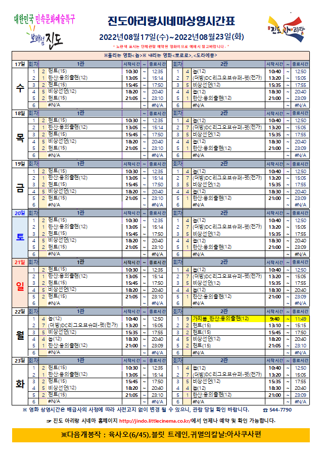 진도아리랑시네마 상영시간표 <2022.08.17(수)~08.23(화)> 안내드립니다.