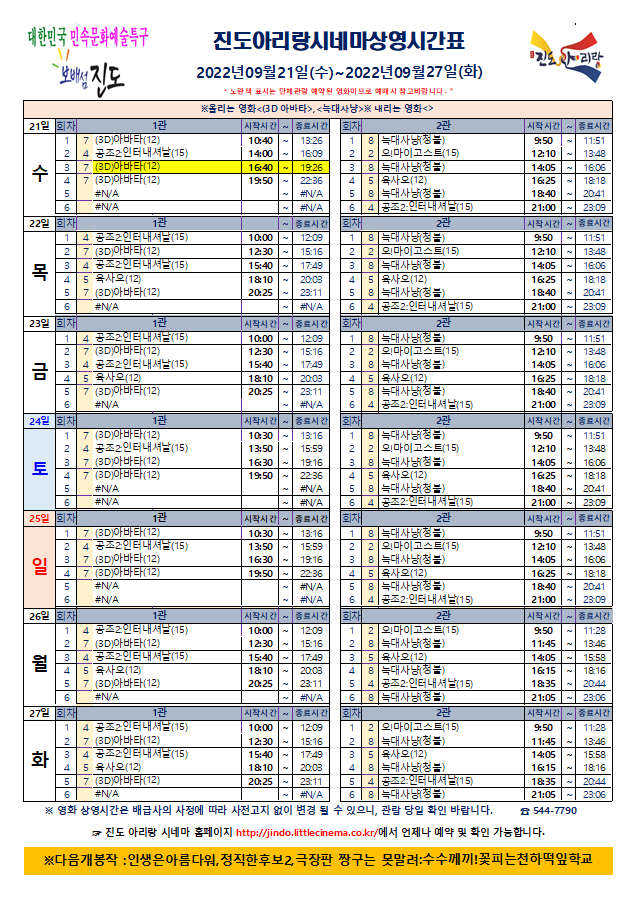 진도아리랑시네마 상영시간표 <2022.09.21(수)~09.27(화)> 안내드립니다.