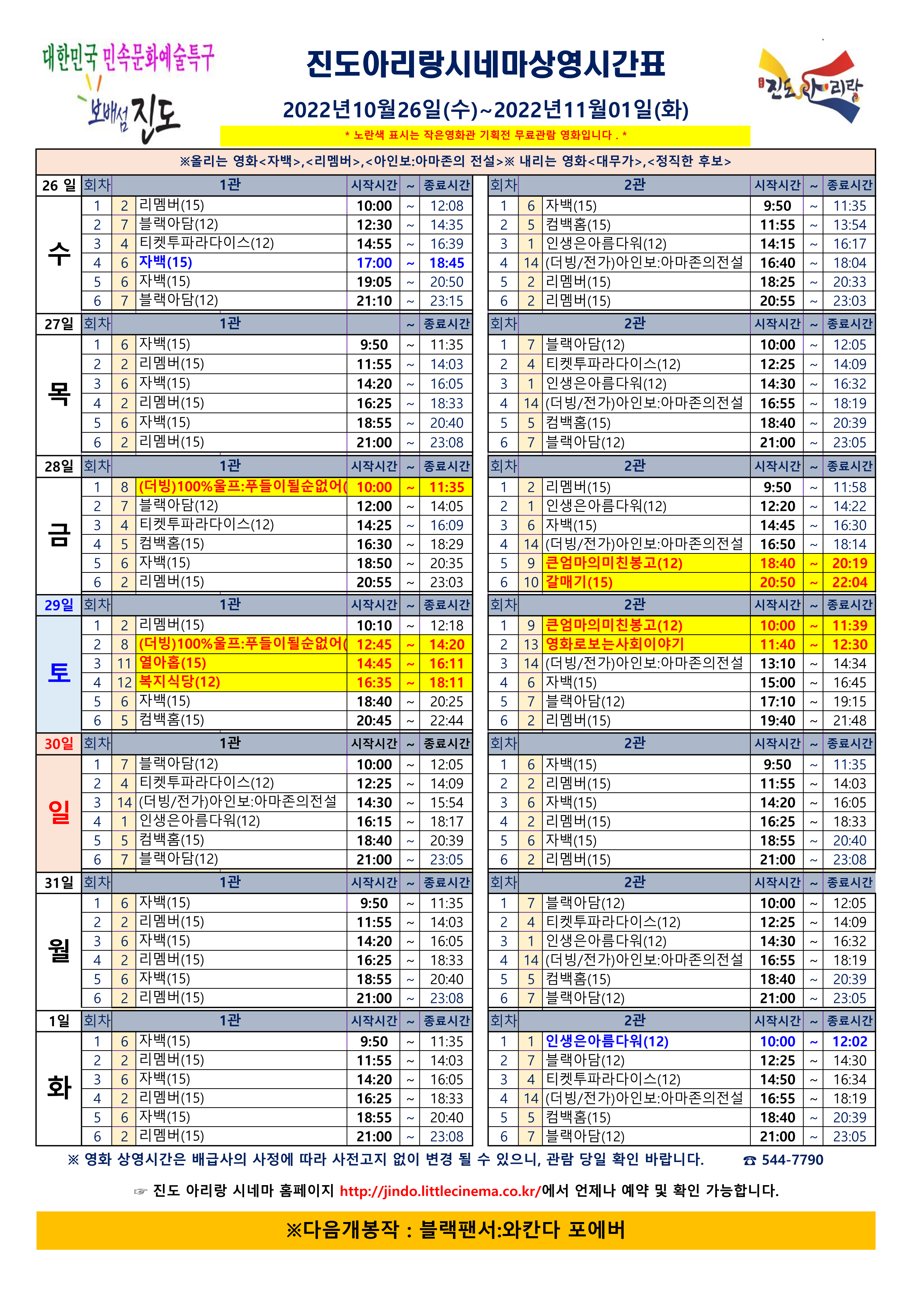 진도아리랑시네마 상영시간표 <2022.10.26(수)~11.01(화)> 안내드립니다.