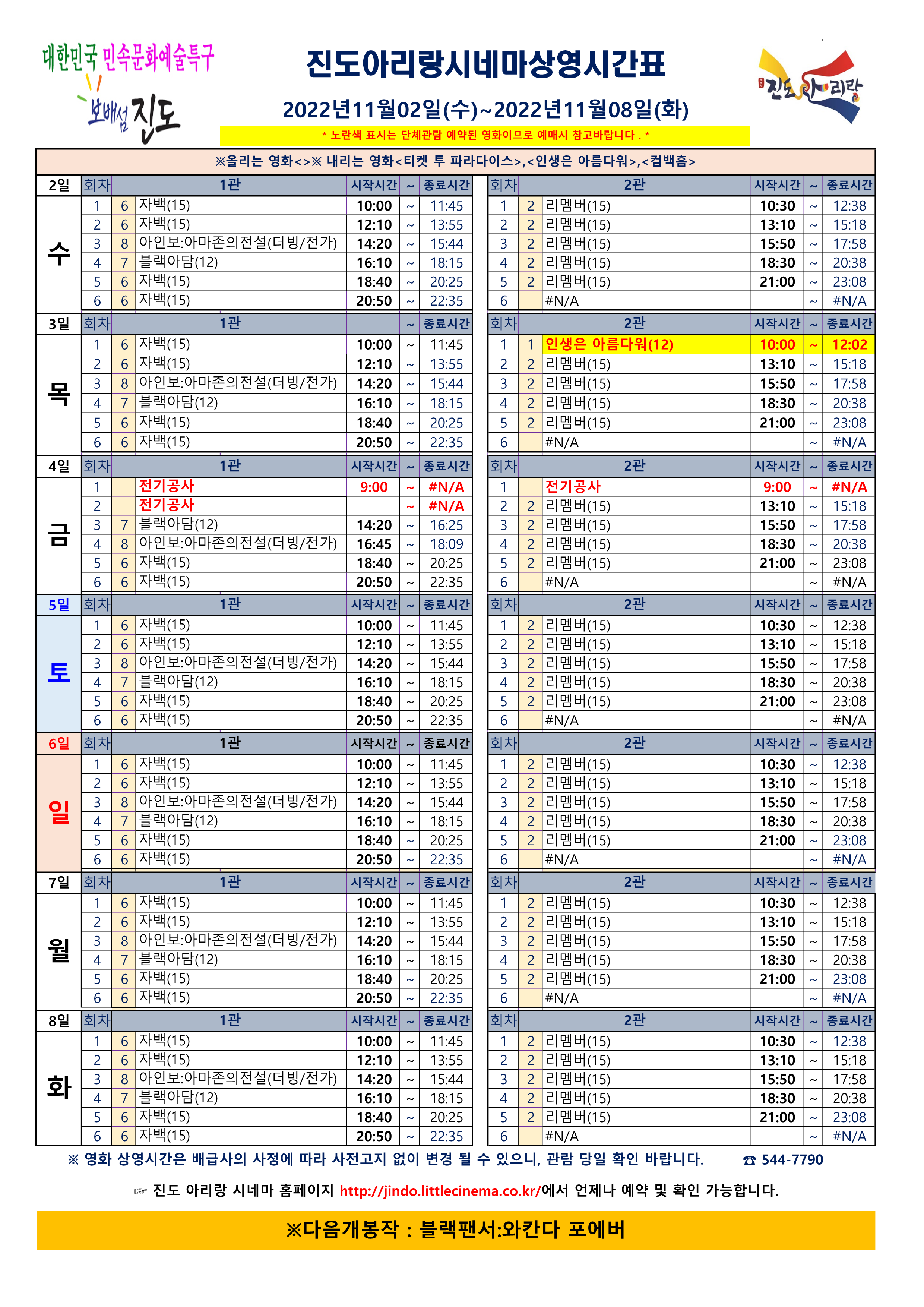 진도아리랑시네마 상영시간표 <2022.11.02(수)~11.08(화)> 안내드립니다.