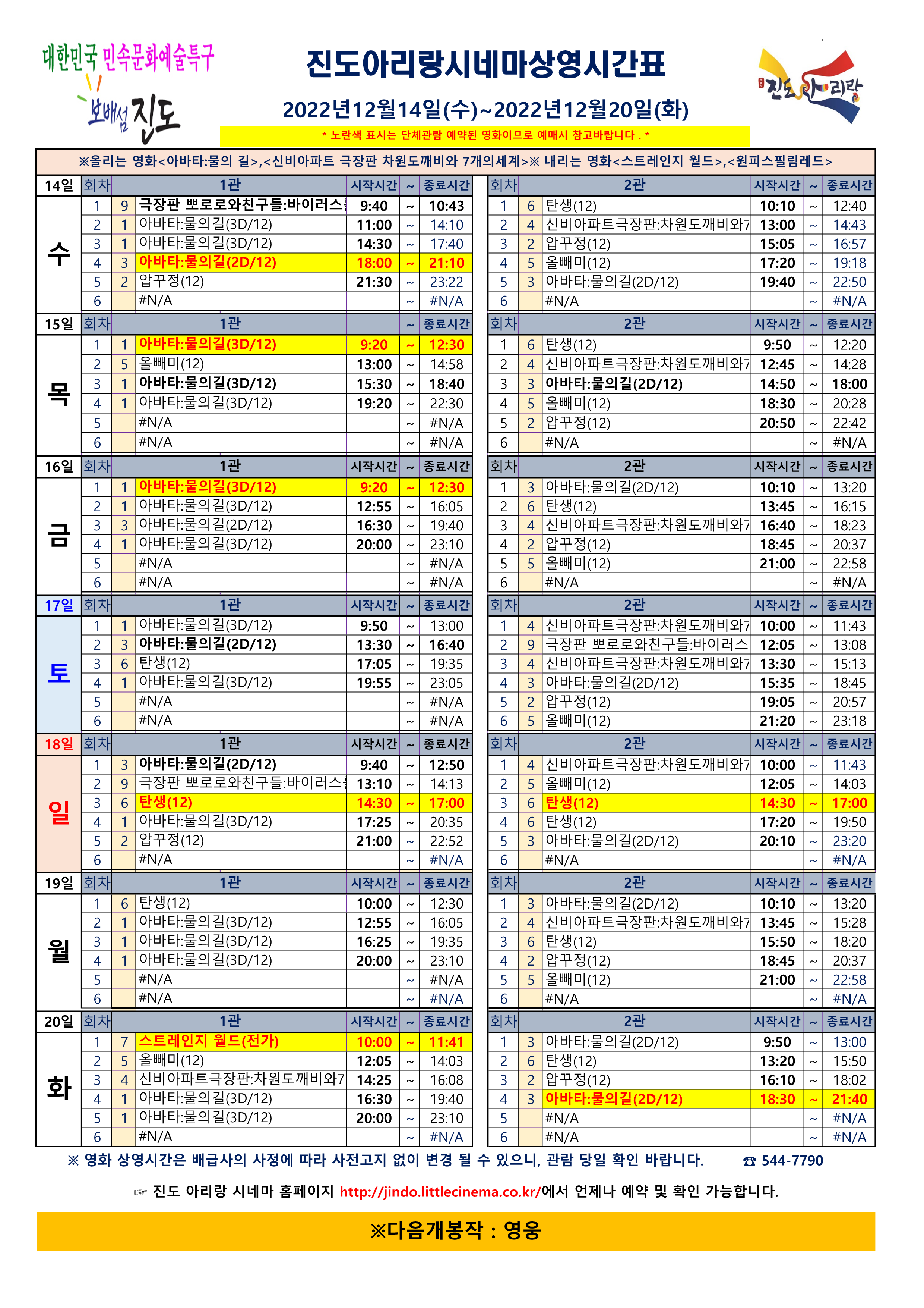 진도아리랑시네마 상영시간표 <2022.12.14(수)~12.20(화)> 안내드립니다.