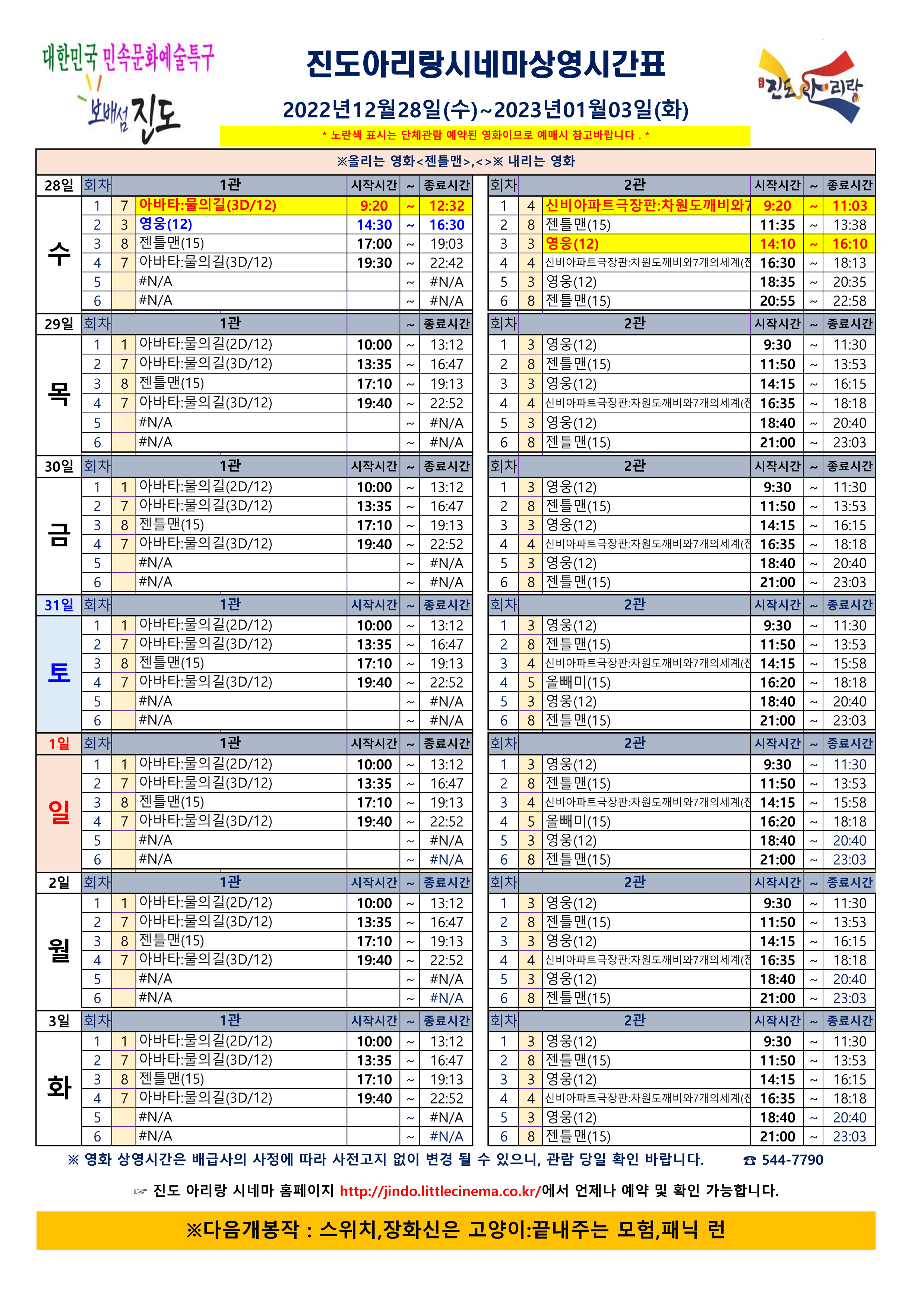 진도아리랑시네마 상영시간표 <2022.12.28(수)~01.03(화)> 안내드립니다.