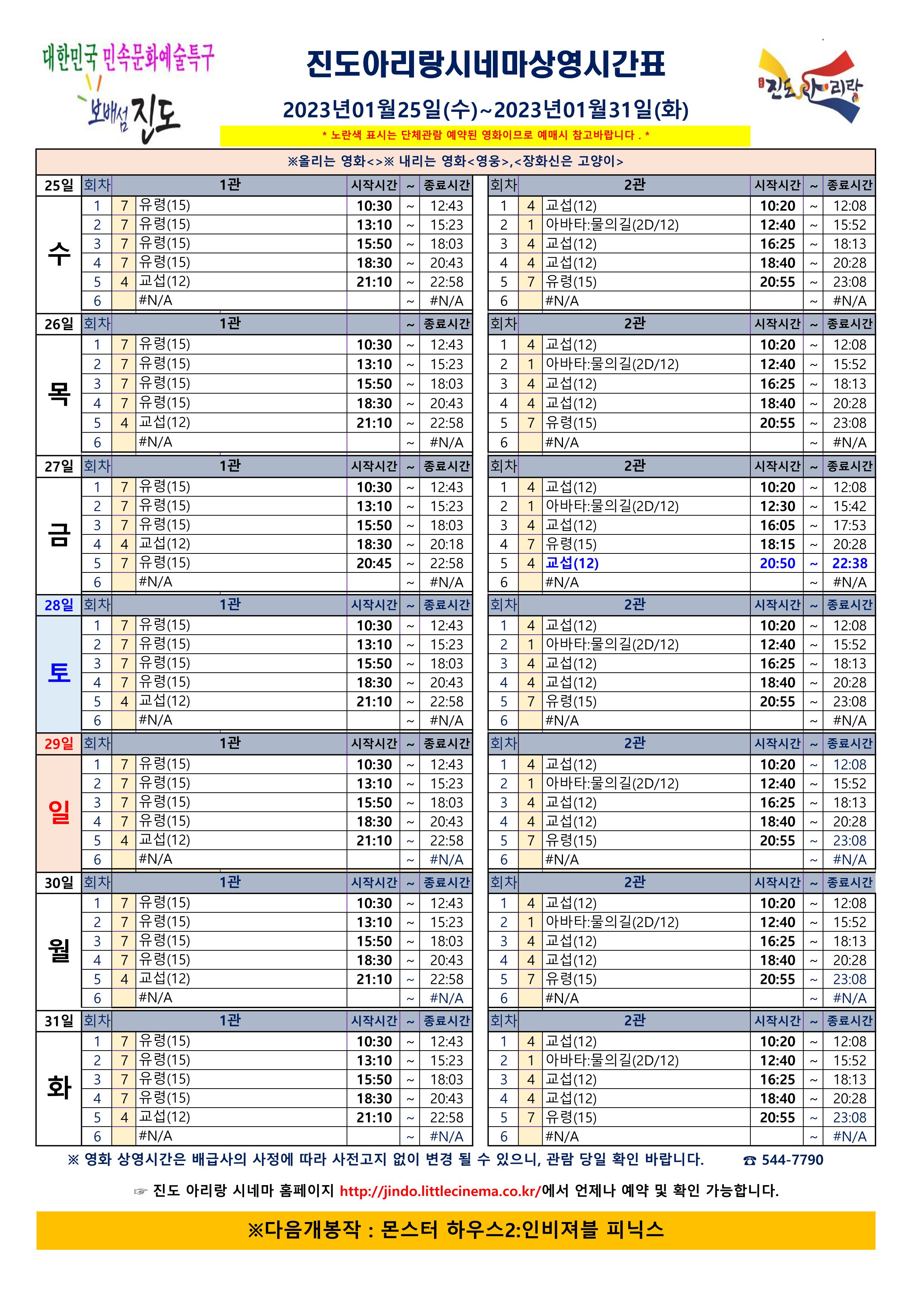 진도아리랑시네마 상영시간표 <2023.01.25(수)~01.31(화)> 안내드립니다.