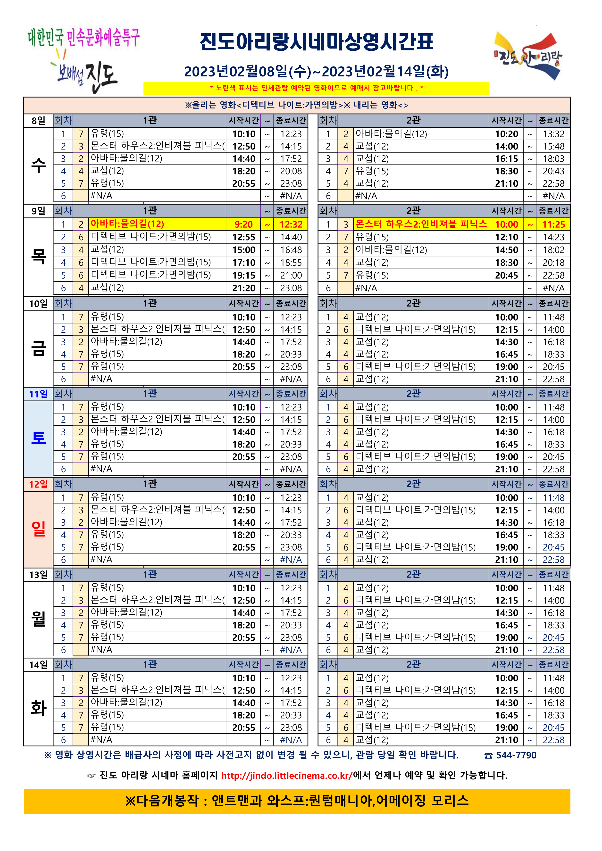 진도아리랑시네마 상영시간표 <2023.02.08(수)~02.14(화)> 안내드립니다.