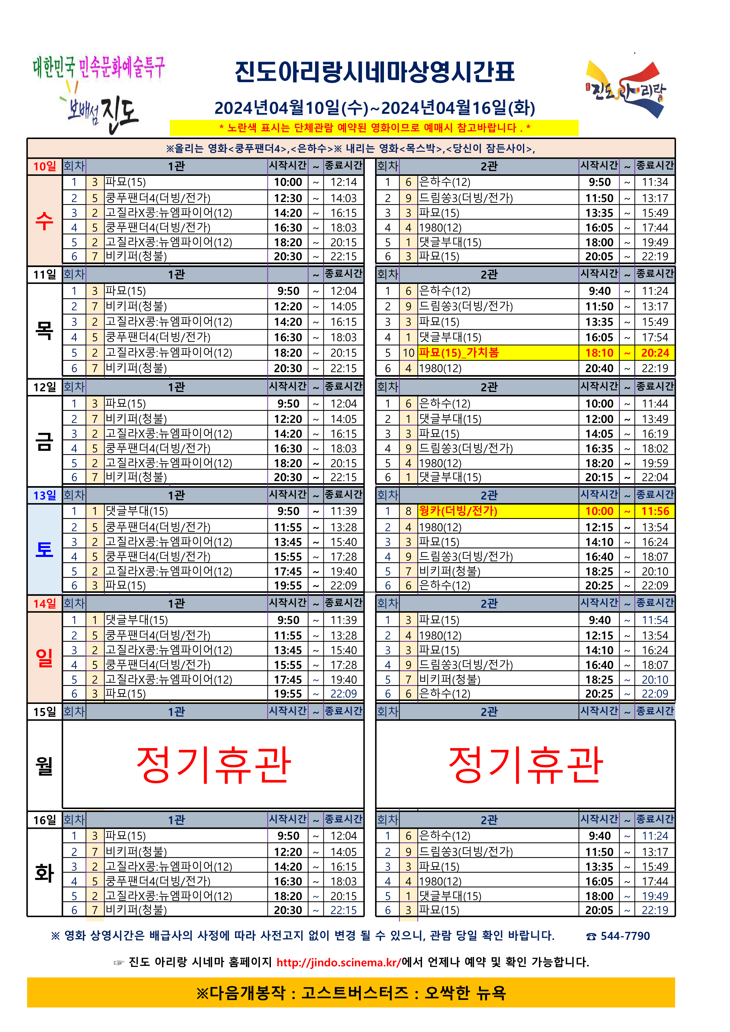 진도아리랑시네마 상영시간표<2024.4.04.10(수) ~ 04.16(화)> 안내드립니다.