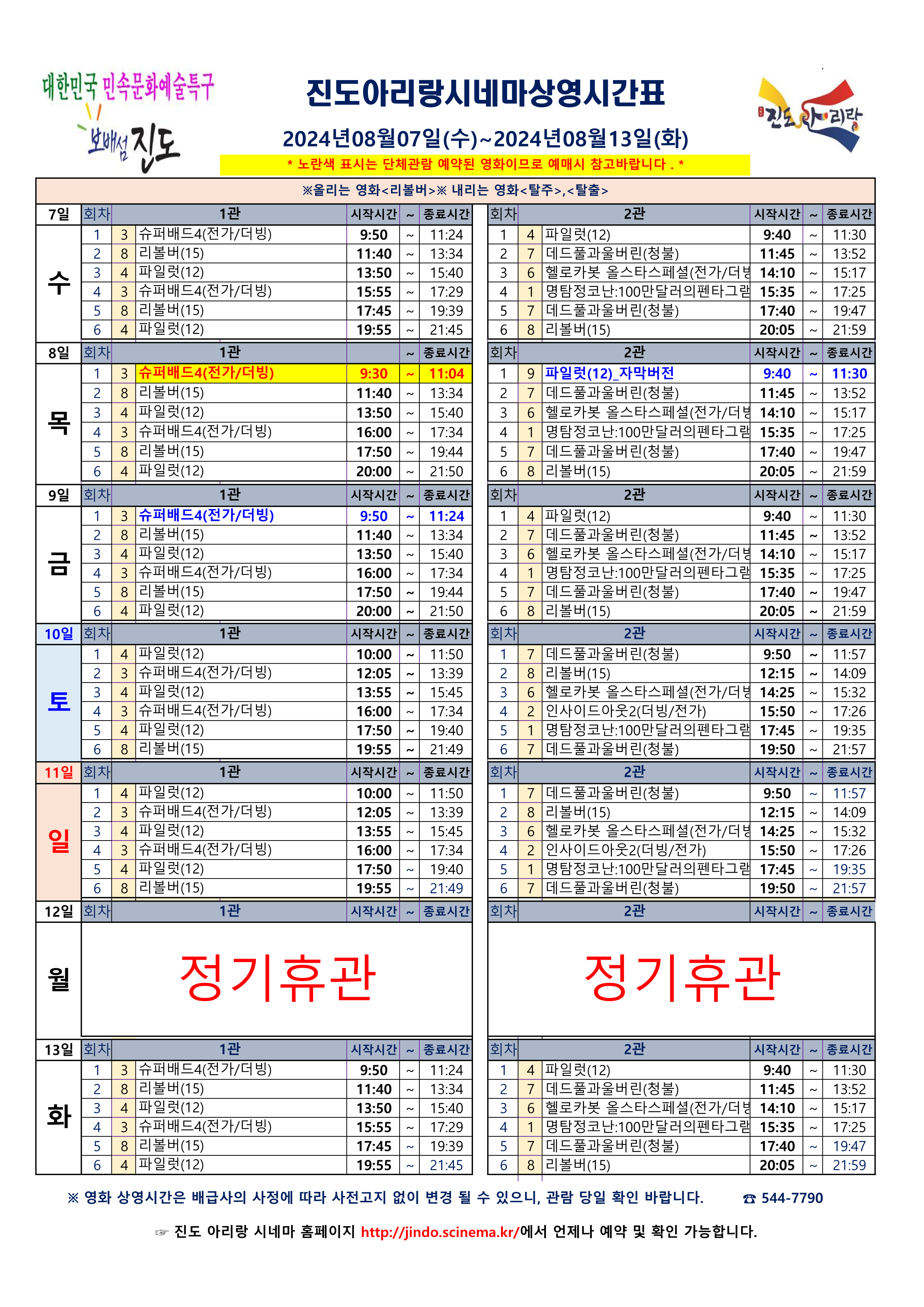 진도아리랑시네마 상영시간표 <2024.08.07(수) ~ 08.13(화)> 안내드립니다.