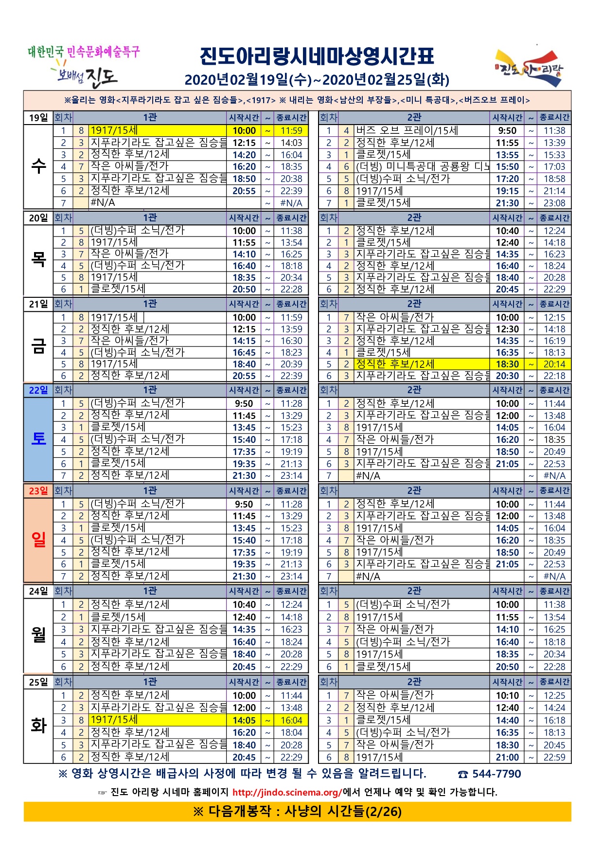 2020.02.19~02.25 상영시간표 안내드립니다.