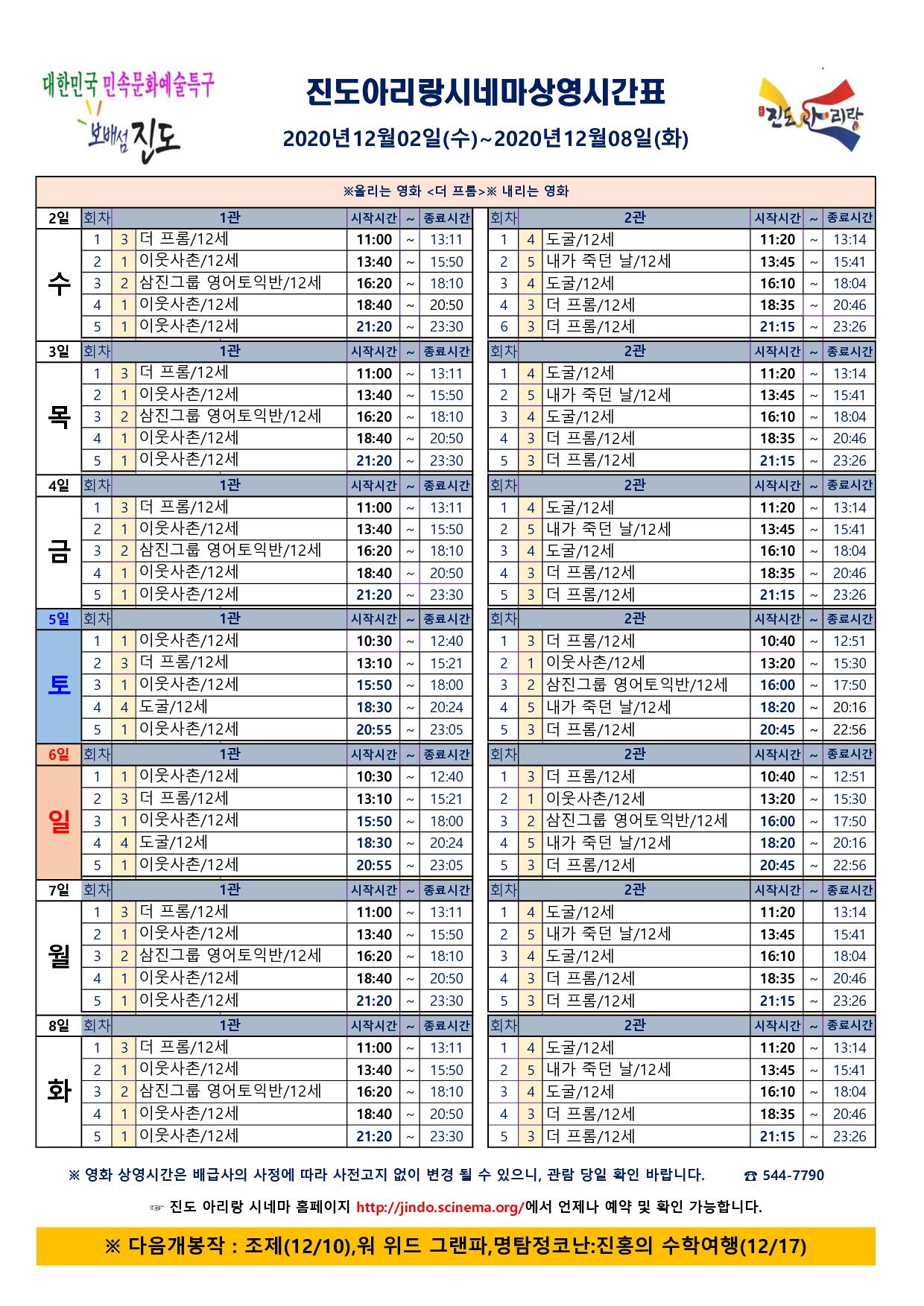 진도아리랑 시네마 영화상영시간표 안내 [2020.12.09.수 ~ 2020.12.15.화]