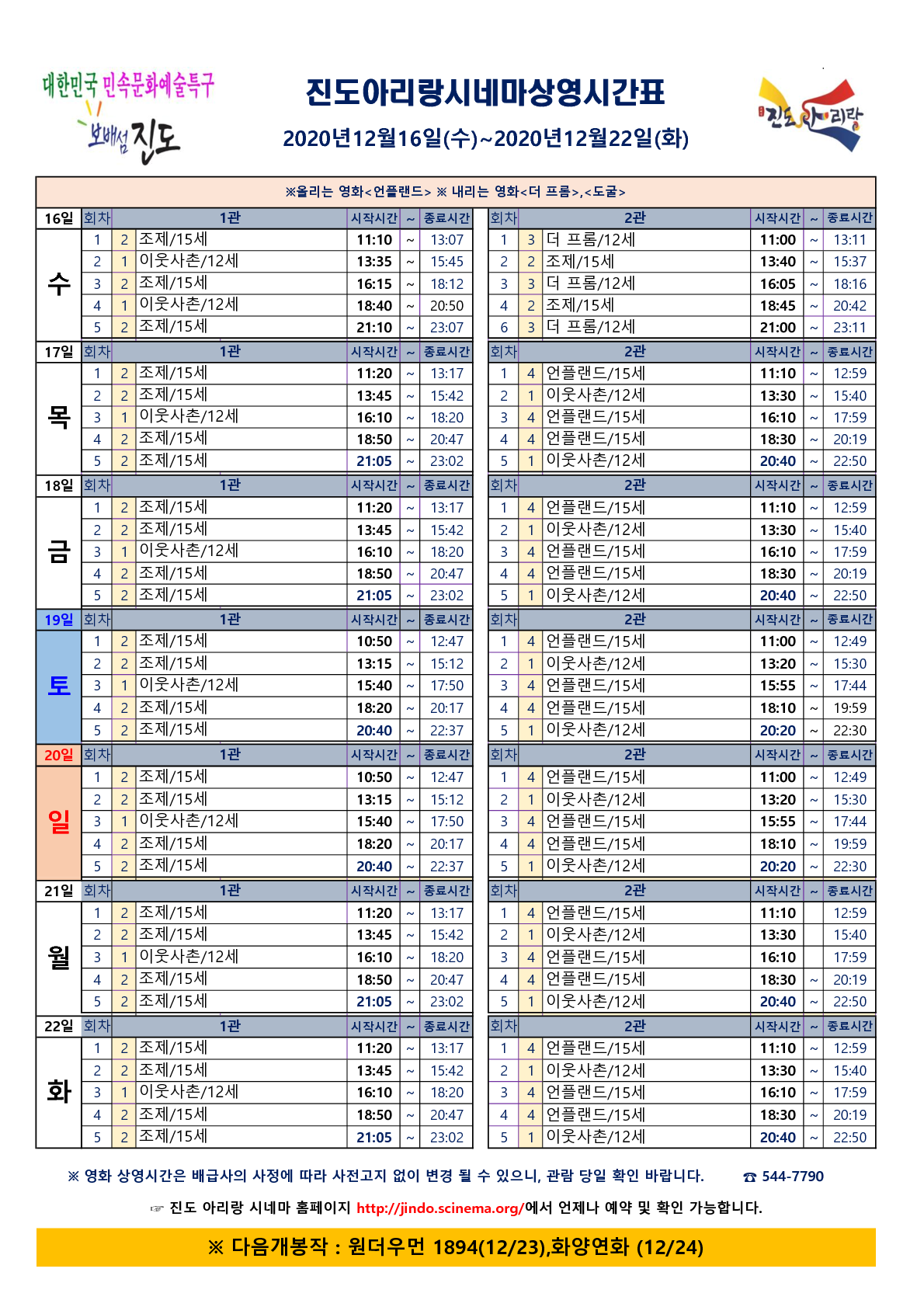*진도아리랑시네마 영화상영시간표 [2020. 12. 16. 수요일 ~ 2020. 12. 22 화요일]