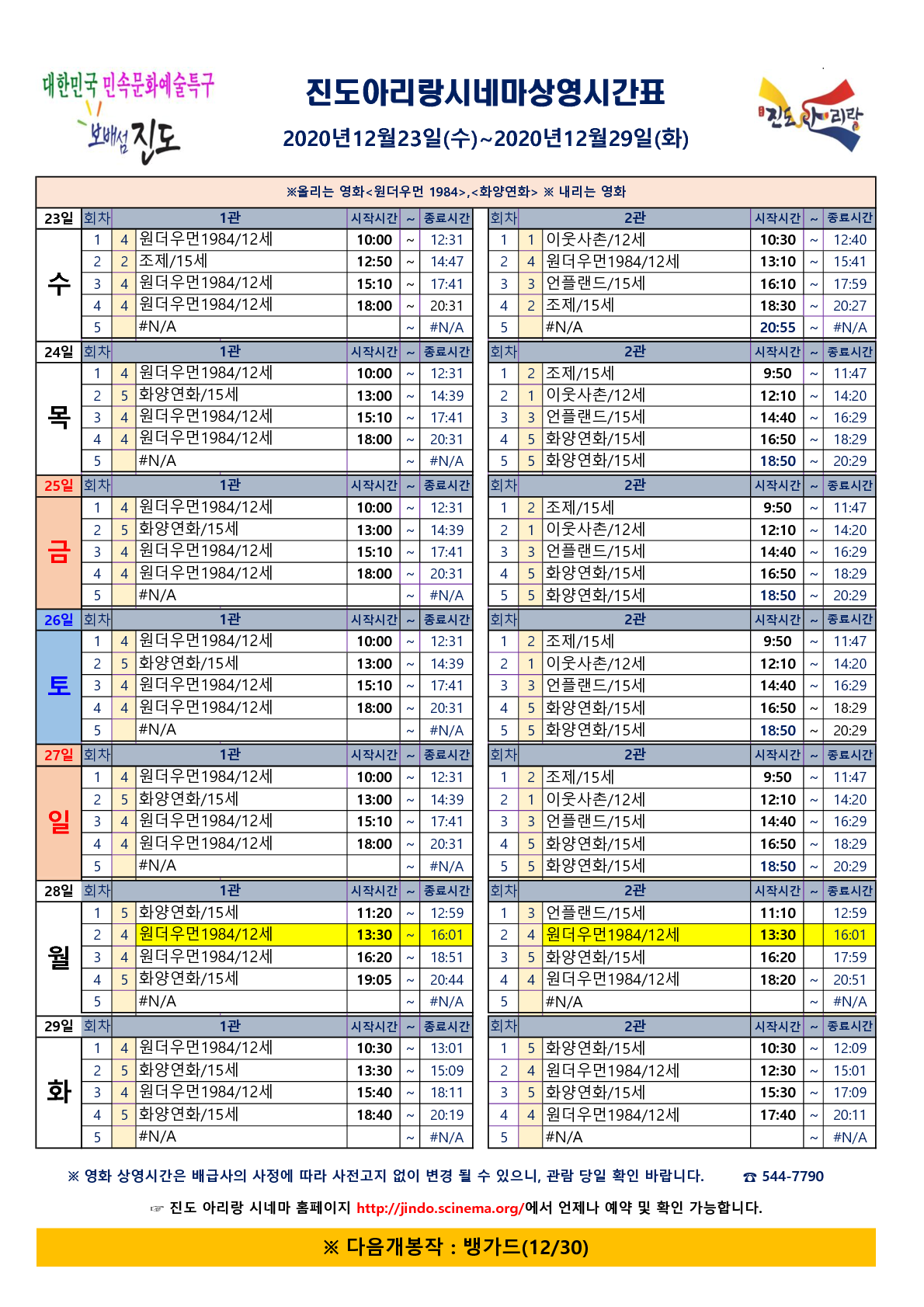 진도아리랑시네마 영화관람상영시간표 안내 [2020. 12. 23. 수 ~ 2020. 12. 29. 화]
