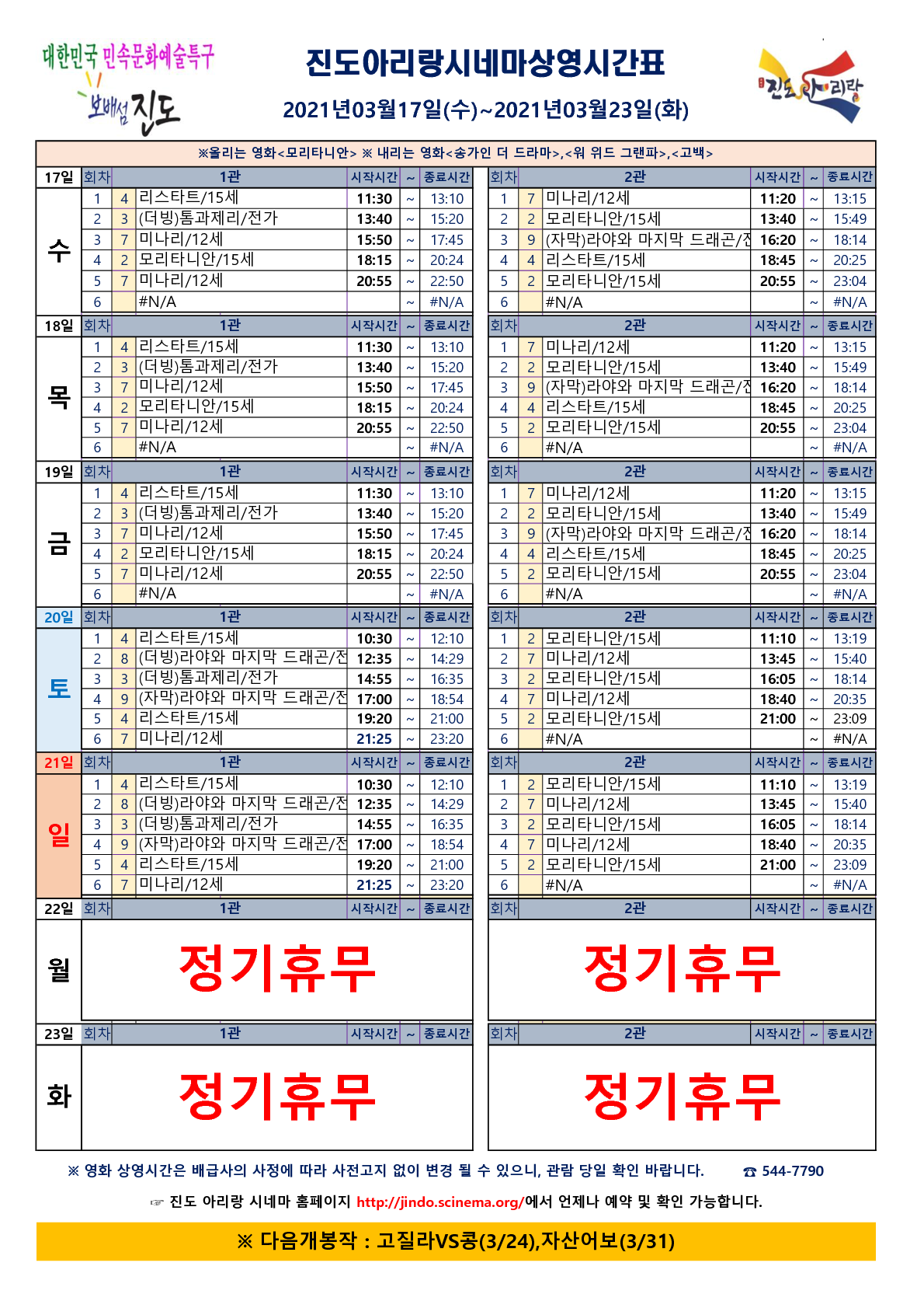 진도아리랑시네마 상영시간표(2021.03.31~04.06) 안내드립니다.