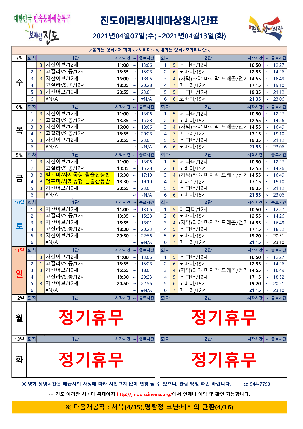 진도아리랑 시네마 상영시간표(2021.04.07~04.13)안내드립니다.