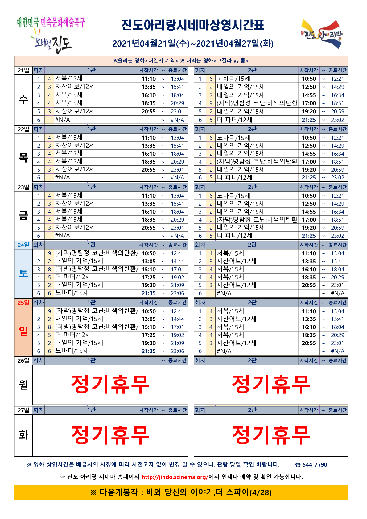 진도아리랑시네마 상영시간표(2021.04.21~04.27) 안내드립니다.
