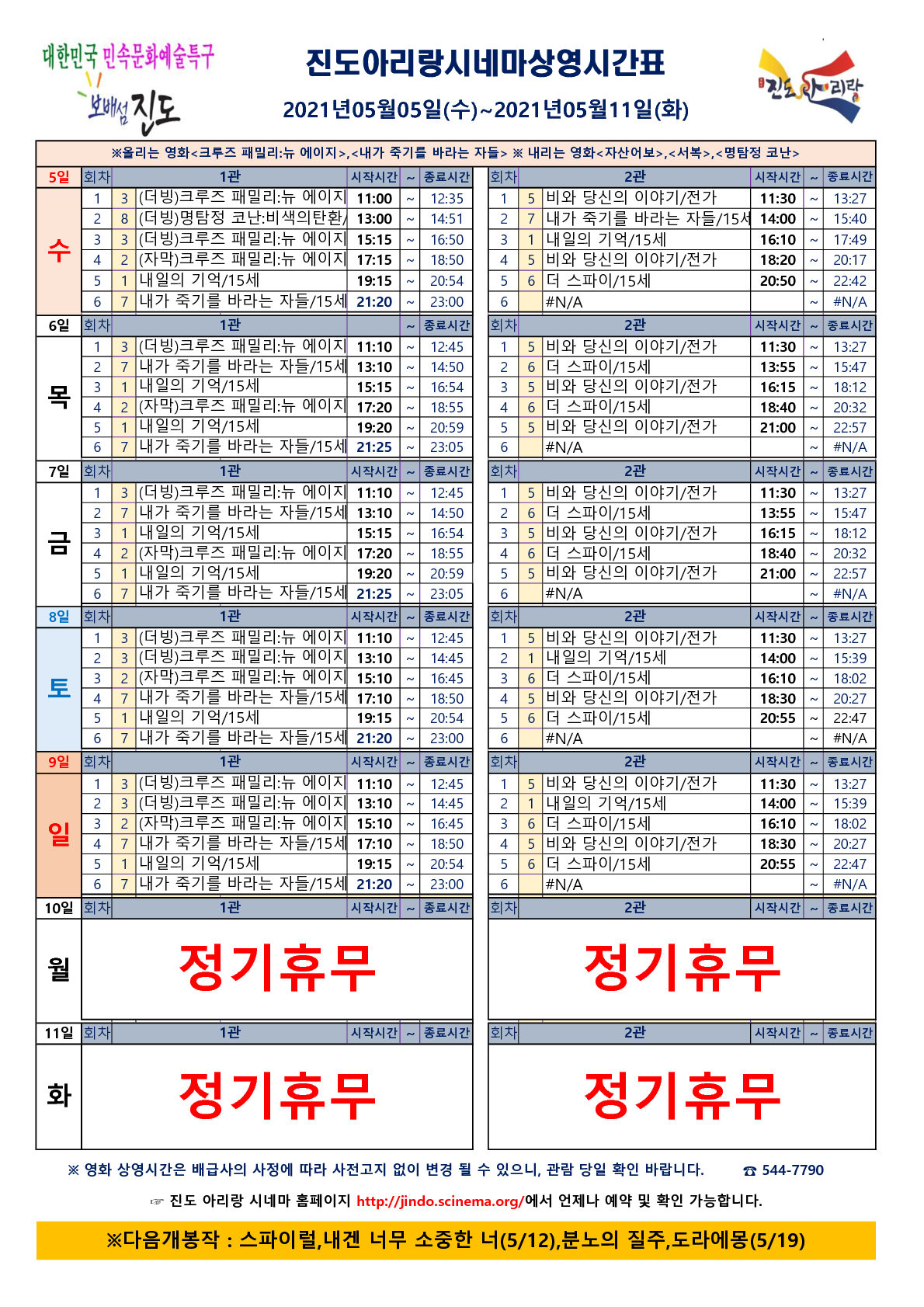 진도아리랑시네마 상영시간표(2021.05.05~05.11) 안내드립니다.