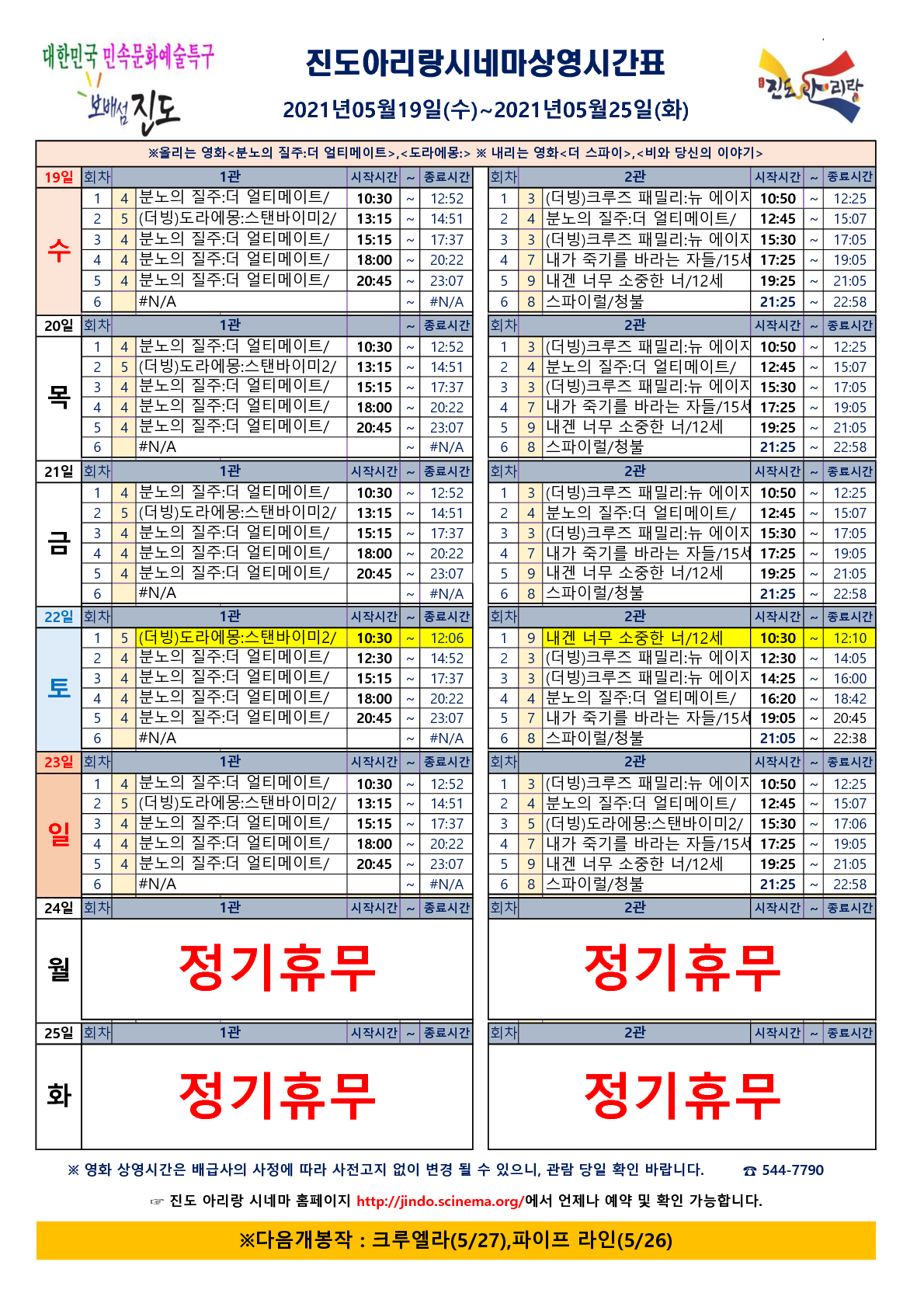 진도아리랑시네마 상영시간표(2021.05.19~05.25) 안내드립니다.