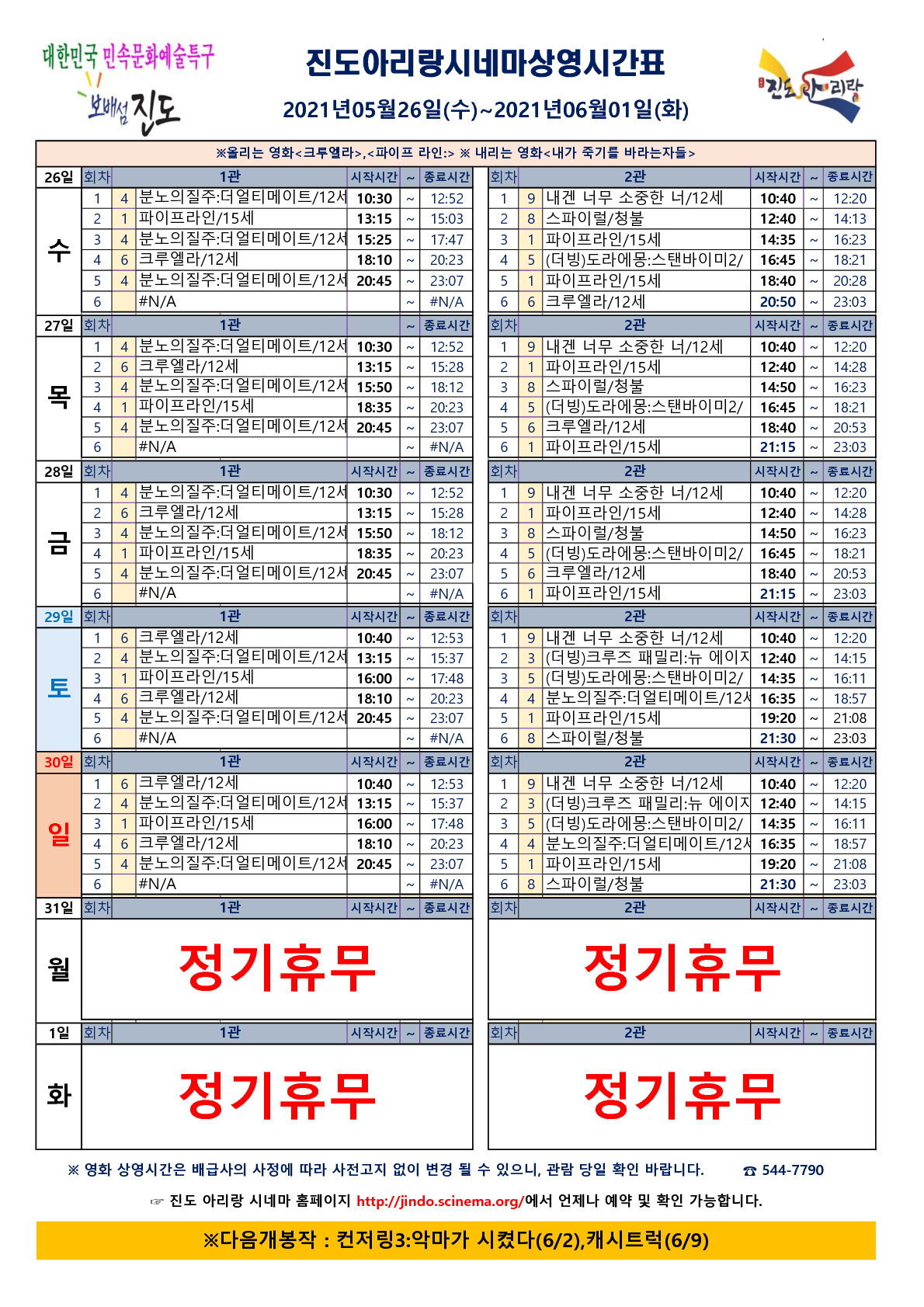 진도아리랑시네마 상영시간표(2021.05.26~06.01) 안내드립니다.