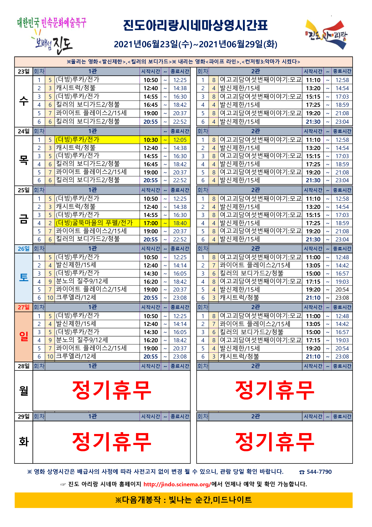 진도아리랑시네마 상영시간표(2021.06.23~06.29) 안내드립니다.