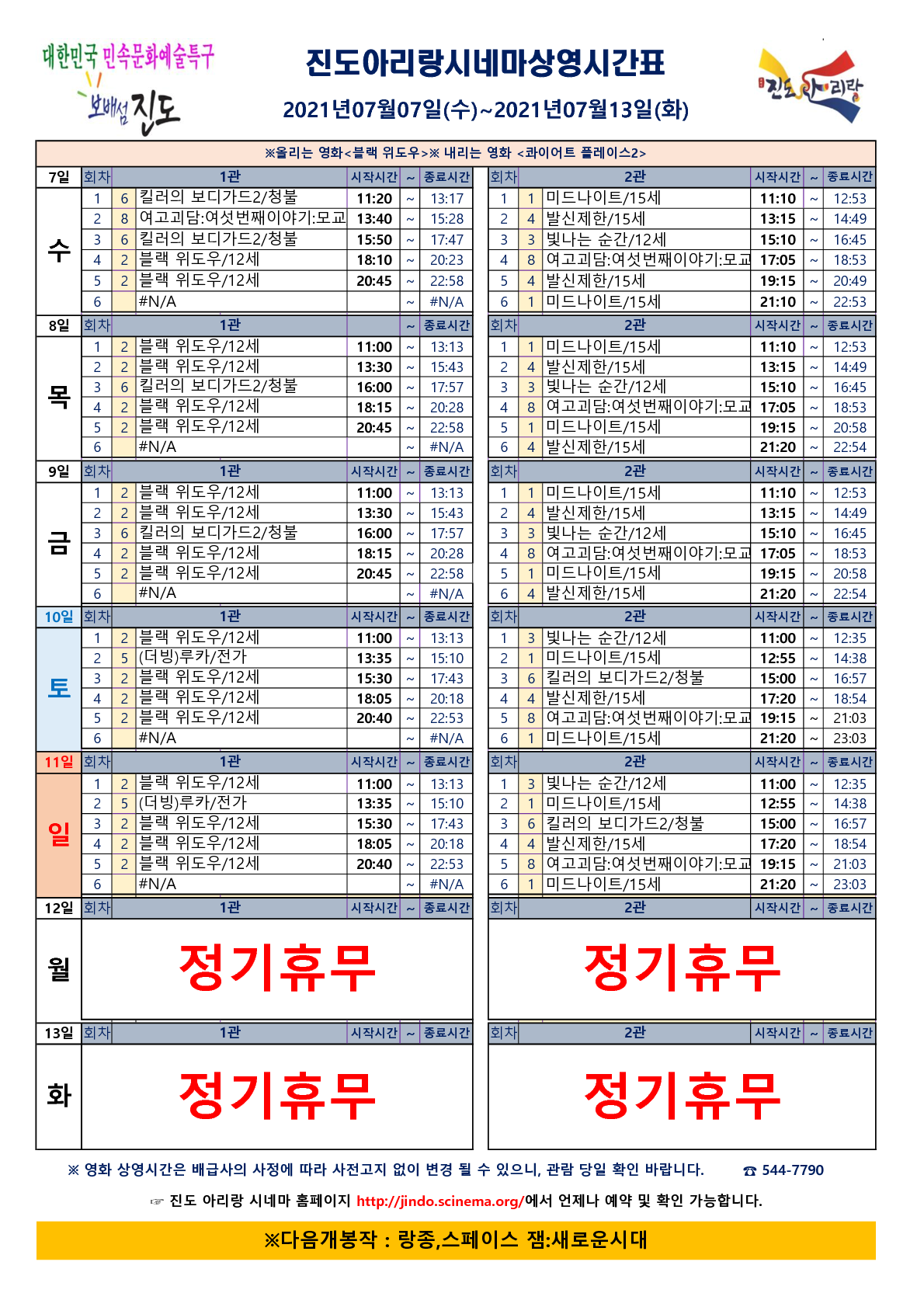 진도아리랑시네마 상영시간표(2021.07.07~07.13) 안내드립니다.