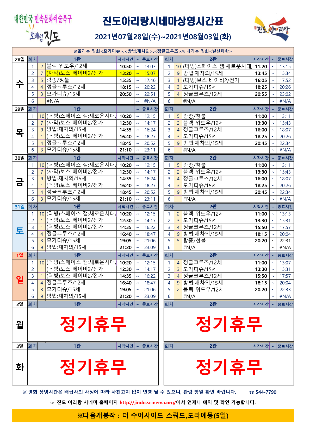 진도아리랑시네마 상영시간표(2021.07.28~08.01) 안내드립니다.