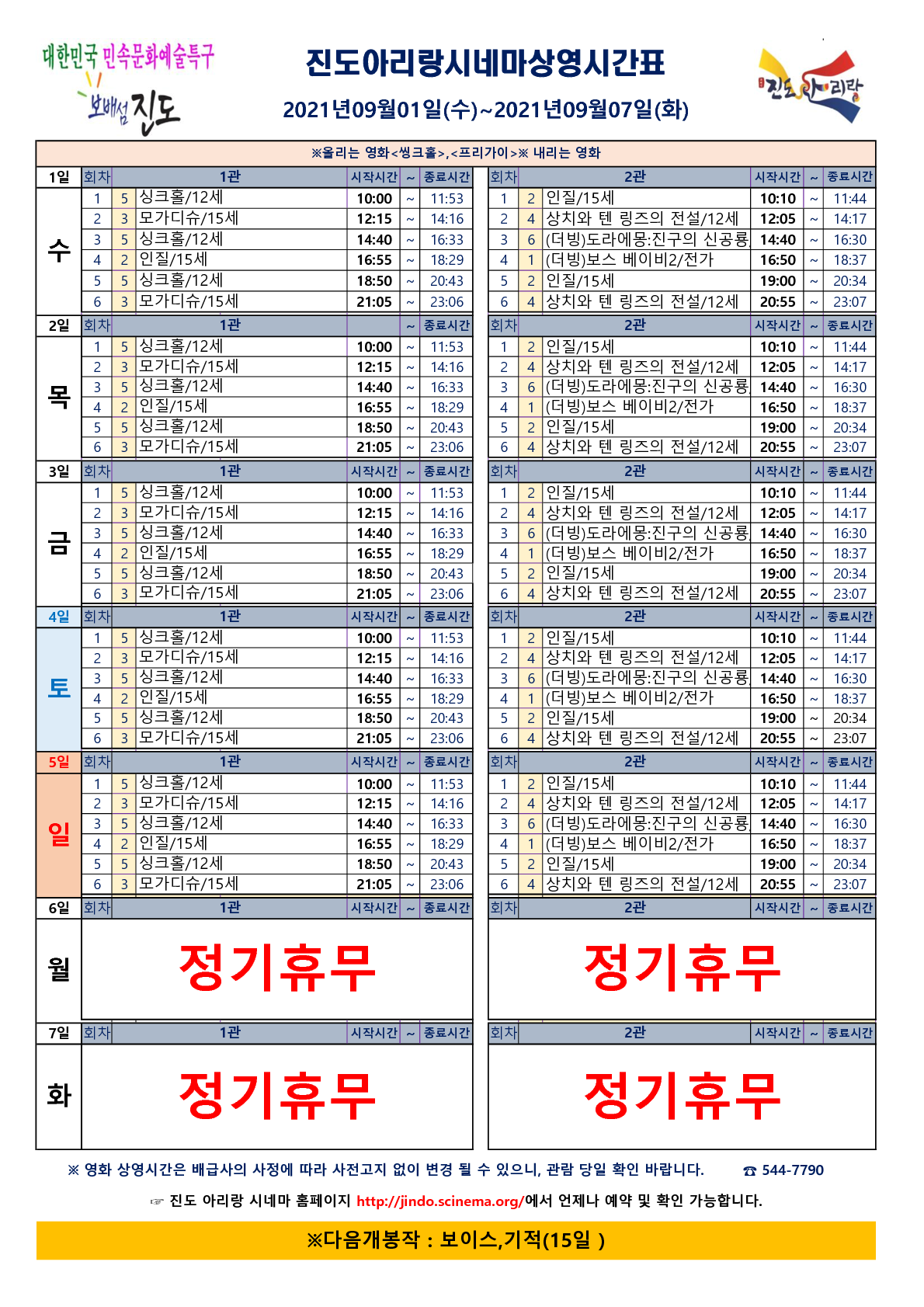 진도아리랑시네마 상영시간표(2021.09.01~09.07) 안내드립니다.