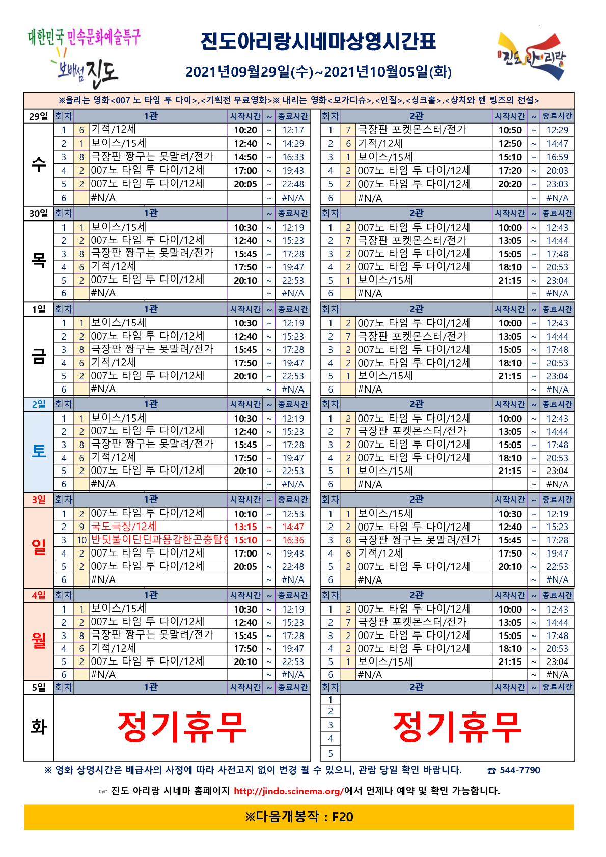 진도아리랑시네마 상영시간표 안내<2021.09.29~10.04>
