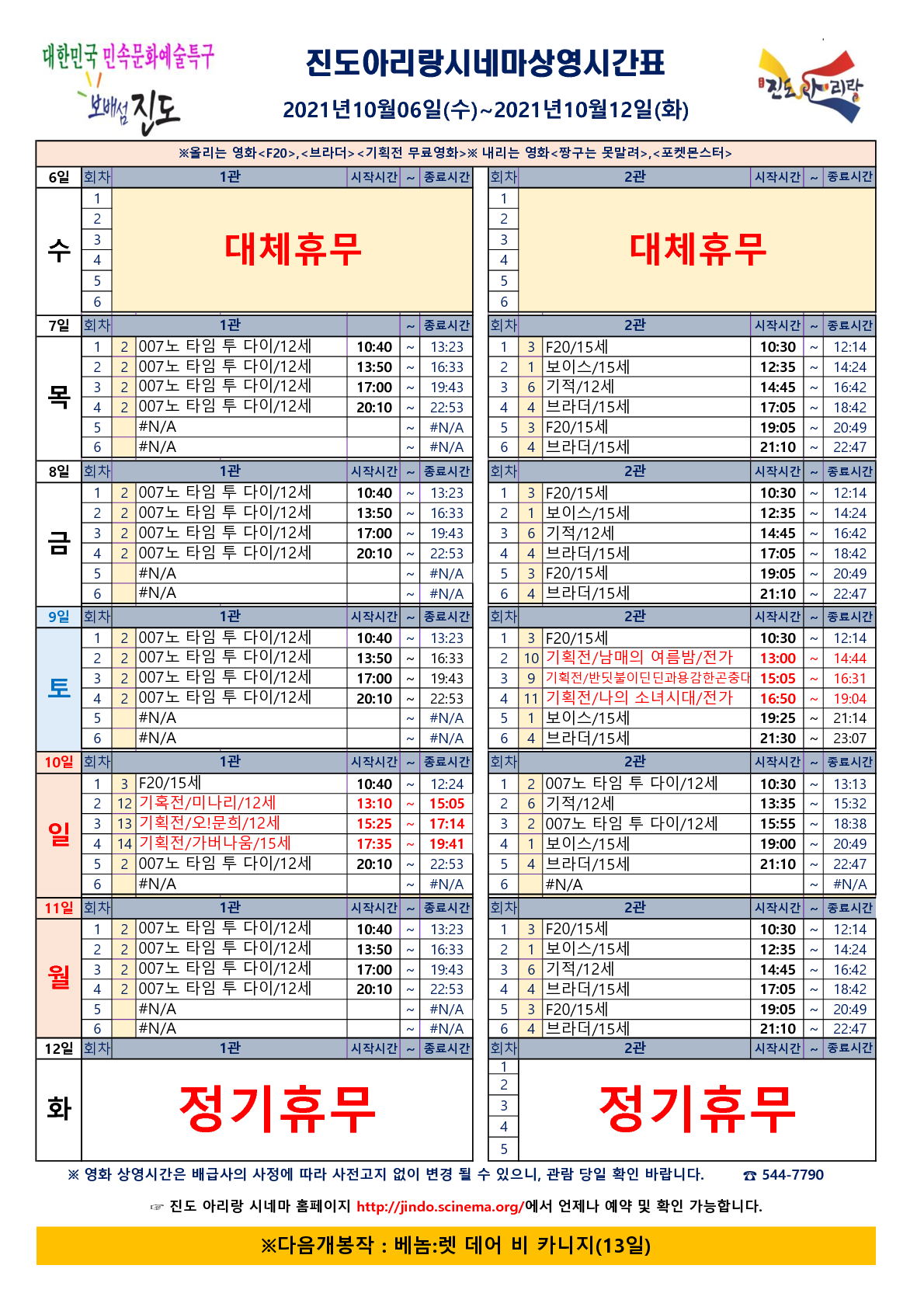 진도아리랑시네마 상영시간표(2021.10.06~10.12) 안내드립니다.