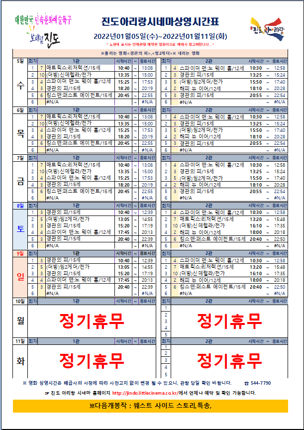 진도아리랑시네마 상영시간표<2022.01.05(수)~01.11(화)>안내 드립니다.