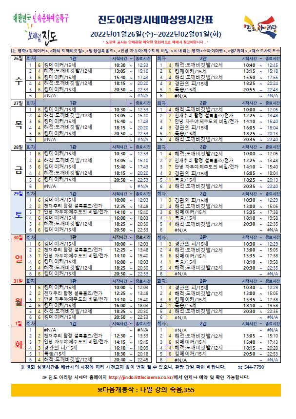 진도아리랑시네마 상영시간표<2022.01.26(수)~02.01(화)> 안내 드립니다.