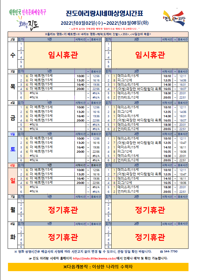 진도아리랑시네마 상영시간표 <2022.03.02(수)~03.08(화)> 안내드립니다.