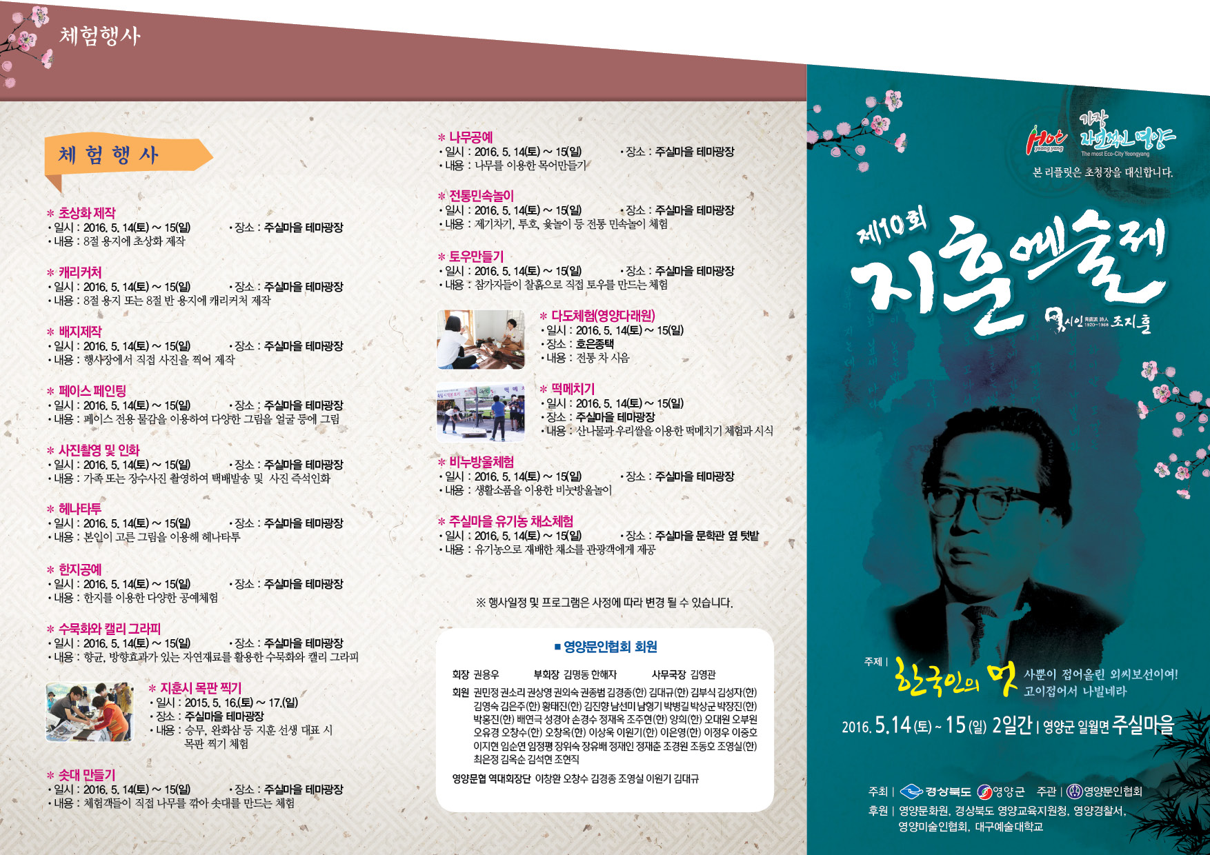 열린게시판 현재메뉴 H > 참여마당 > 열린게시판 링크복사 인쇄 <제10회 지훈예술제>개최 안내 운영자 조회수 : 1541 첨부파일 10회 지훈예술제-리플릿-앞_76CD.tmp.jpg (626.34 KB) 다운로드 첨부파일 10회 지훈예술제-리플릿-뒤.jpg (630.15 KB) 다운로드 ※ 클릭하면 커집니다.