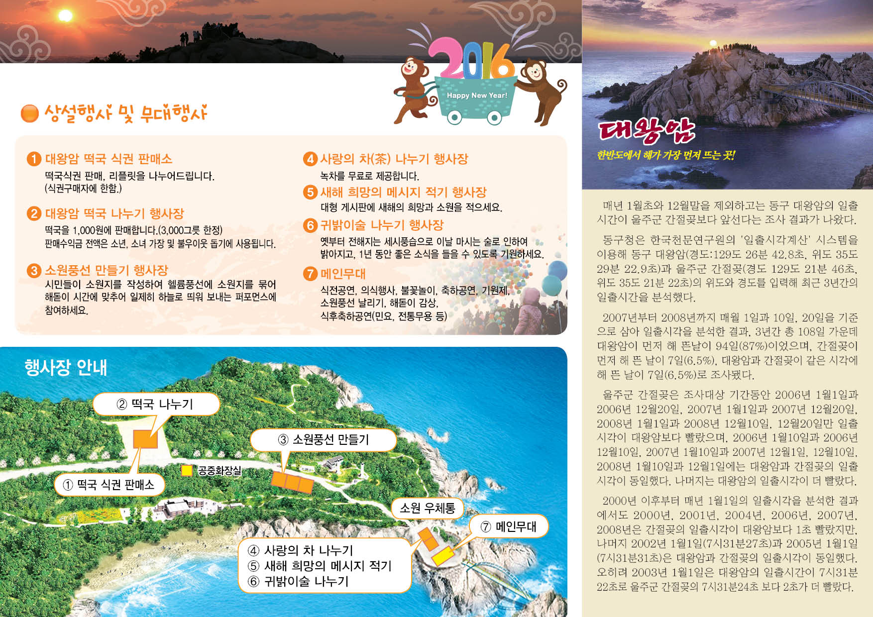 열린게시판 현재메뉴 H > 참여마당 > 열린게시판 링크복사 인쇄 <2016 대왕암 해맞이 행사> 안내 운영자 조회수 : 1576 첨부파일 2016 해맞이- 리플렛.jpg (360.07 KB) 다운로드 첨부파일 2016 해맞이- 리플렛2_1579.tmp.jpg (377.17 KB) 다운로드 ※ 클릭하면 커집니다.