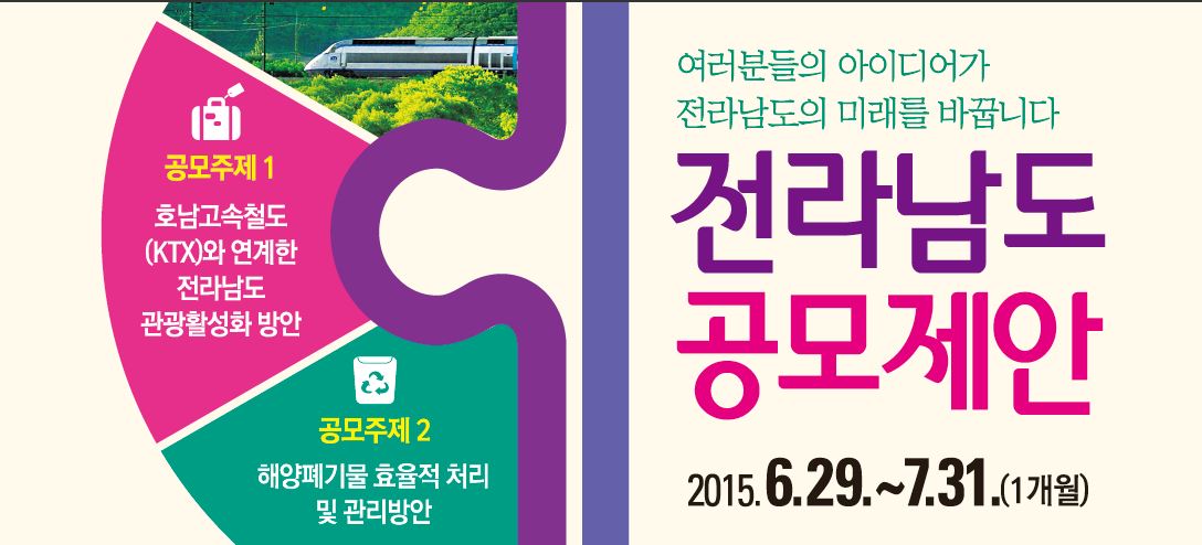 활기, 매력, 온정의 가치를 가진 「생명의 땅 전남」을 주민과 함께 만들어가고자 다양한 의견 수렴을 위해 다음과 같이 공모제안을 실시하오니 많은 참여 바랍니다.