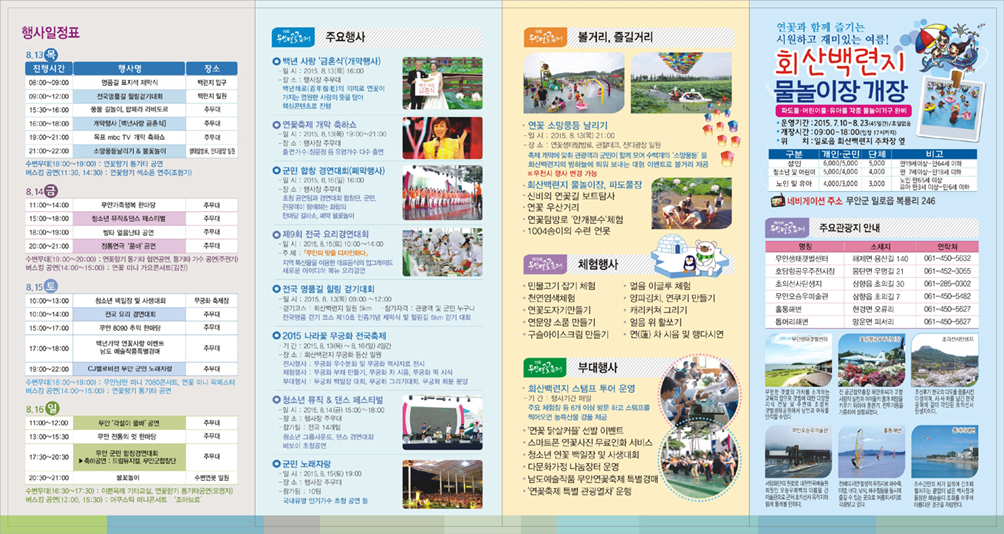 열린게시판 현재메뉴 H > 참여마당 > 열린게시판 링크복사 인쇄 <제19회 무안 연꽃 축제> 안내 운영자 조회수 : 1885 첨부파일 제19회 무안연꽃축제 포스터.jpg (2.26 MB) 다운로드 첨부파일 제19회 무안연꽃축제 리플릿 - 앞면.jpg (444.51 KB) 다운로드 첨부파일 제19회 무안연꽃축제 리플릿 - 뒷면.jpg (546.30 KB) 다운로드