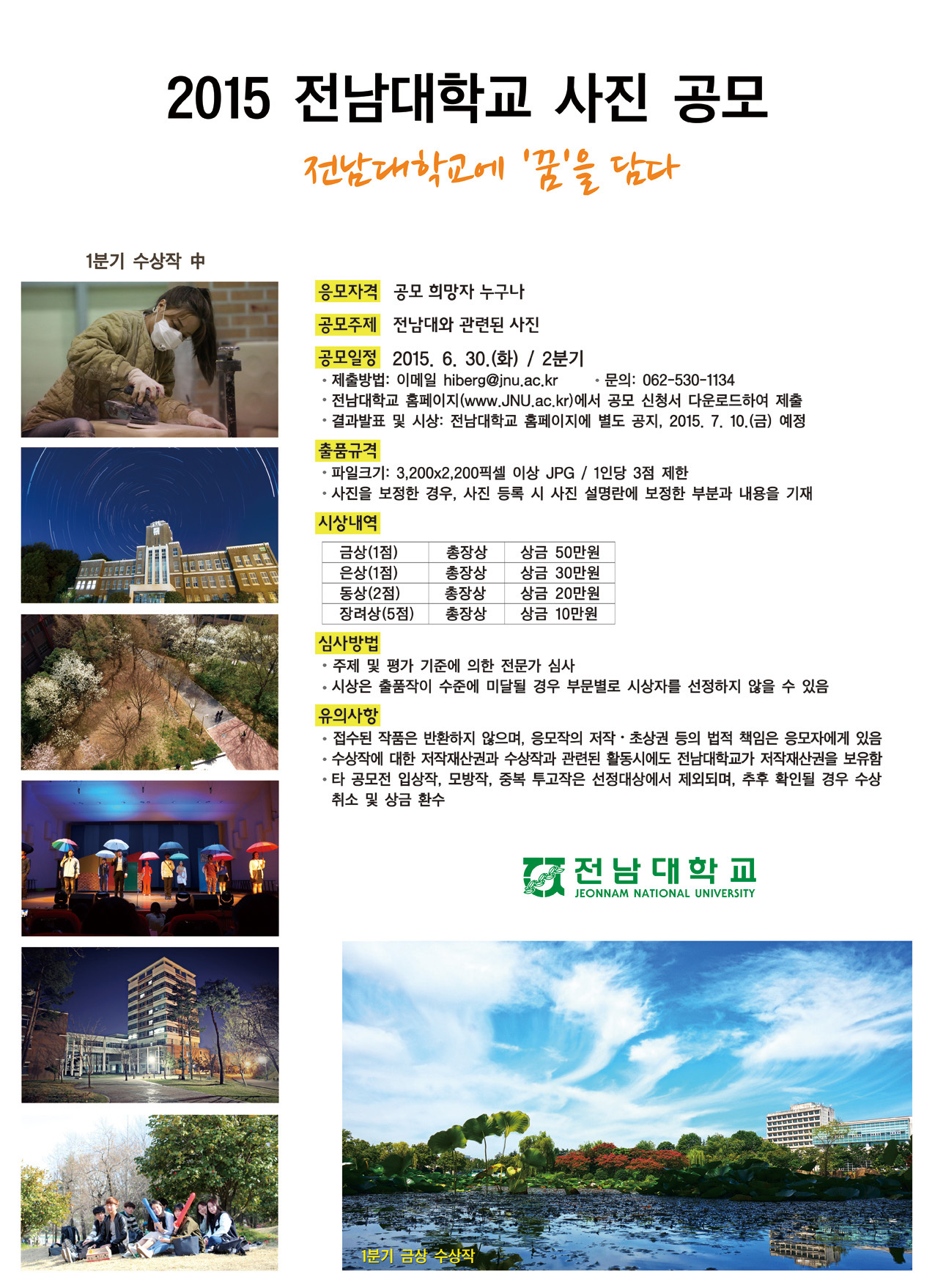 열린게시판 현재메뉴 H > 참여마당 > 열린게시판 링크복사 인쇄 2015 전남대학교 사진공모 안내 운영자 조회수 : 1436 첨부파일 ~MG9brptDDF.jpg (860.41 KB) 다운로드