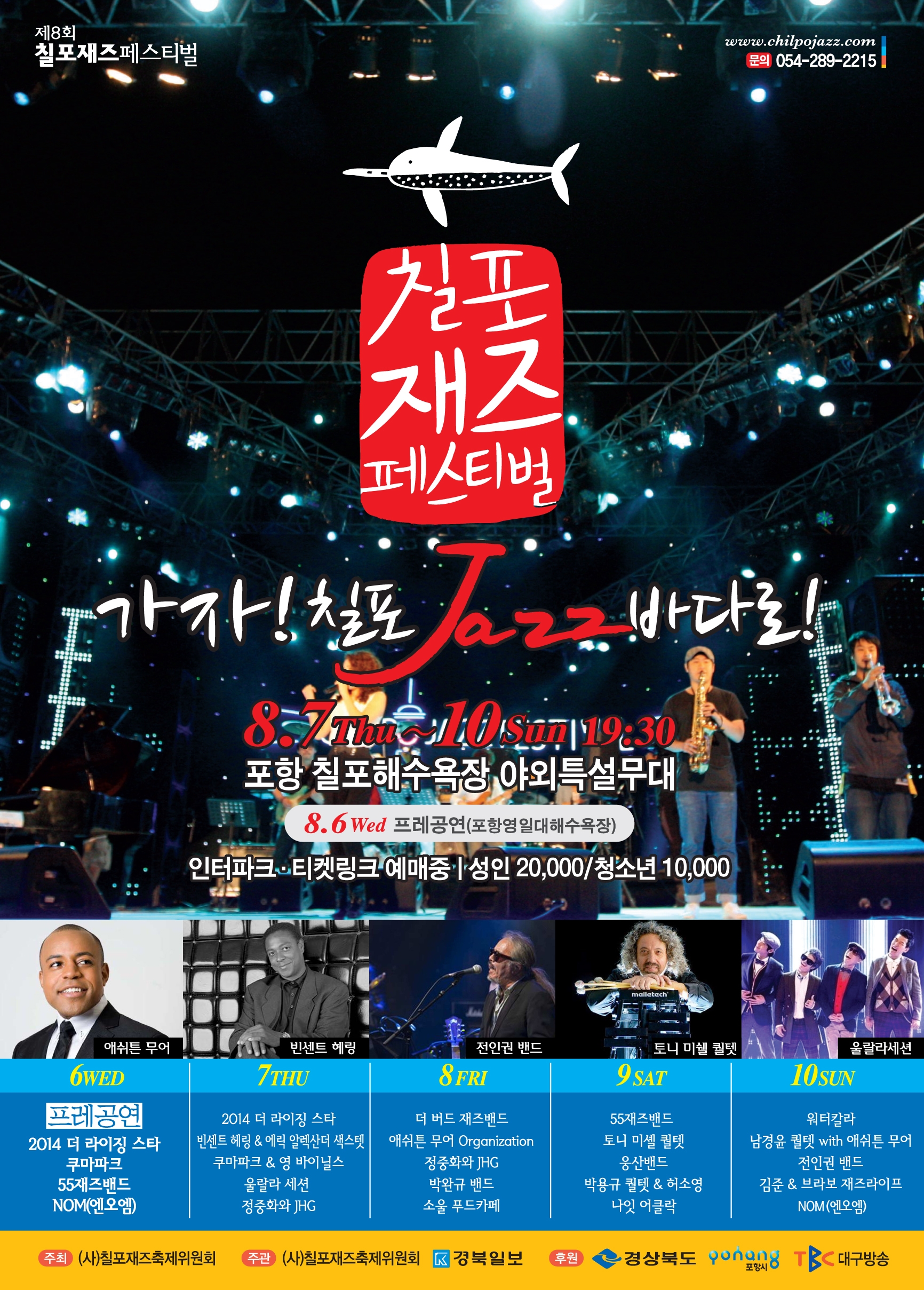 열린게시판 현재메뉴 H > 참여마당 > 열린게시판 링크복사 인쇄 제8회 포항칠포재즈페스티벌 안내 운영자 조회수 : 1945 첨부파일 포스터2.JPG (2.35 MB) 다운로드 제8회 포항칠포재즈페스티벌 - 기 간 : 2014. 8. 6.(수) ~ 8. 10.(일), 5일간 - 장 소 : 영일대해수욕장, 칠포해수욕장 - 주 관 :(사)칠포재즈축제위원회 - 출연진 : 빈센트 헤링, 울랄라세션, 전인권밴드 등 국내외 유명 뮤지션 20개팀 - 좌 석 : 3,000석, 유료좌석 운영(일반 2만 원, 고등학생 이하 1만 원)