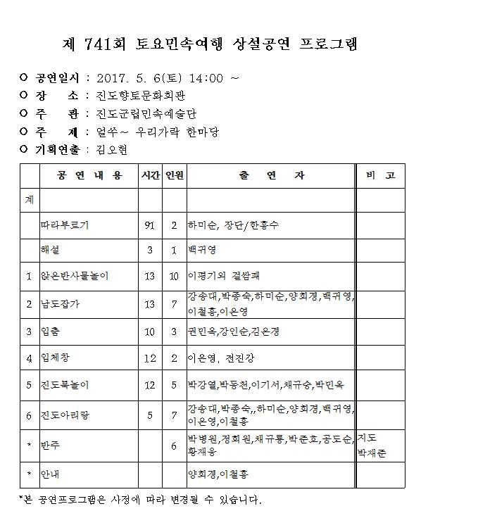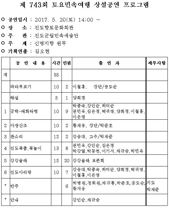 공지사항 현재메뉴 H > 참여마당 > 공지사항 링크복사 인쇄 <5월 토요민속여행 상설공연> 안내 조회수 : 1516 첨부파일 1.JPG (86.28 KB) 다운로드 첨부파일 2.JPG (84.81 KB) 다운로드 첨부파일 3.JPG (85.75 KB) 다운로드 첨부파일 4.JPG (84.01 KB) 다운로드