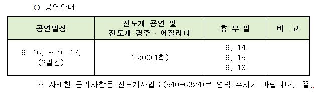 공지사항 현재메뉴 H > 참여마당 > 공지사항 링크복사 인쇄 <추석 명절 진도개 테마파크 공연>안내 조회수 : 1407 첨부파일 11.JPG (28.82 KB) 다운로드 민족 대명절 추석을 맞이하여 우리군을 찾는 관광객 및 귀성객에게 볼거리를 제공하고자 진도개 테마파크 공연 일정을 안내하오니