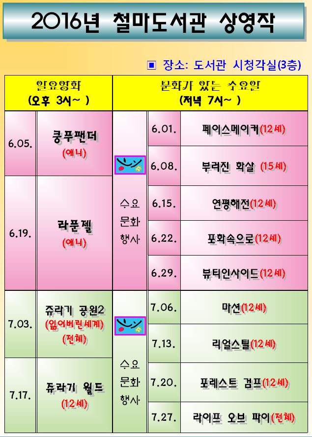 공지사항 현재메뉴 H > 참여마당 > 공지사항 링크복사 인쇄 『6~7월 일요영화 & 문화가 있는 수요일 상영작』안내 조회수 : 1500 첨부파일 6~7월 상영작.JPG (107.64 KB) 다운로드