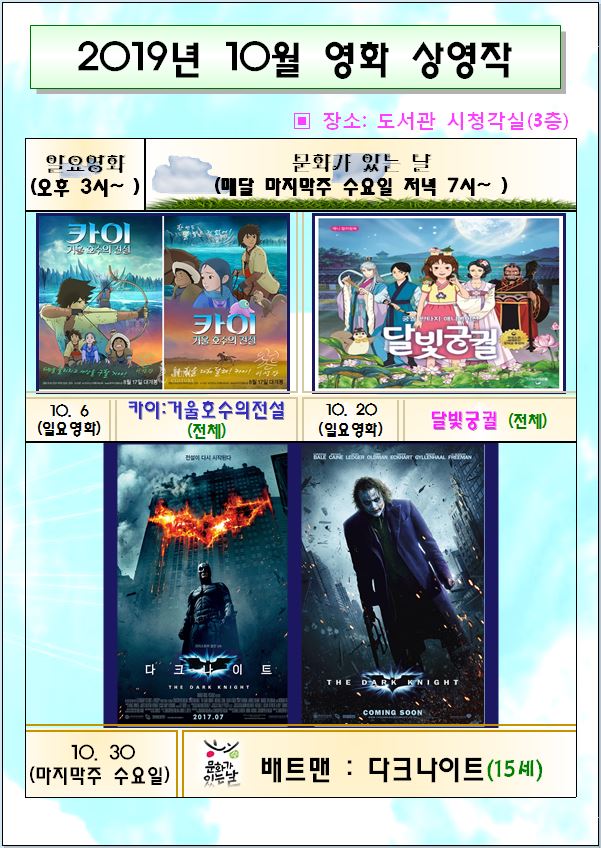 공지사항 현재메뉴 H > 참여마당 > 공지사항 링크복사 인쇄 2019. 10월 '문화가 있는 수요일' 상영DVD소개 조회수 : 1332 첨부파일 10월 영화상영.JPG (125.52 KB) 다운로드