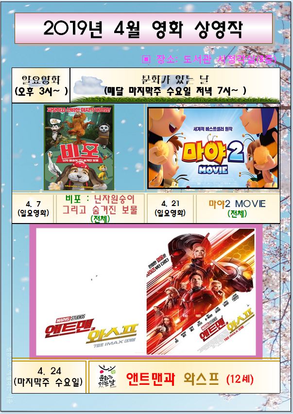 공지사항 현재메뉴 H > 참여마당 > 공지사항 링크복사 인쇄 2019. 4월 '문화가 있는 수요일' 상영DVD소개 조회수 : 1225 첨부파일 2019년 4월 상영작.JPG (130.00 KB) 다운로드
