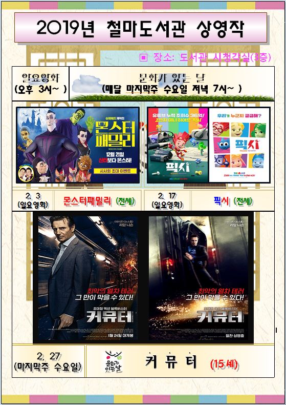 공지사항 현재메뉴 H > 참여마당 > 공지사항 링크복사 인쇄 2019. 2월 '문화가 있는 수요일' 상영DVD소개 조회수 : 1276 첨부파일 2월.JPG (122.77 KB) 다운로드