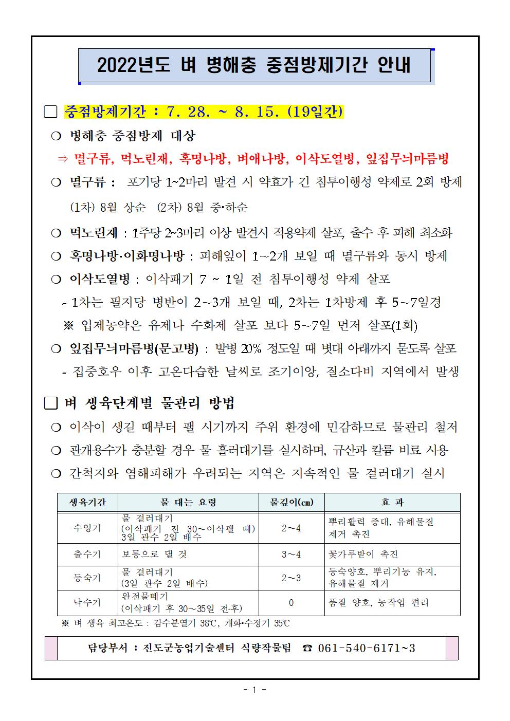 여름철 고온·다습한 기상으로 벼 병해충 발생 및 비래해충 유입이 우려됨에 따라 다음과 같이 『벼 병해충 중점 방제 기간』을 운영 안내 드립니다.