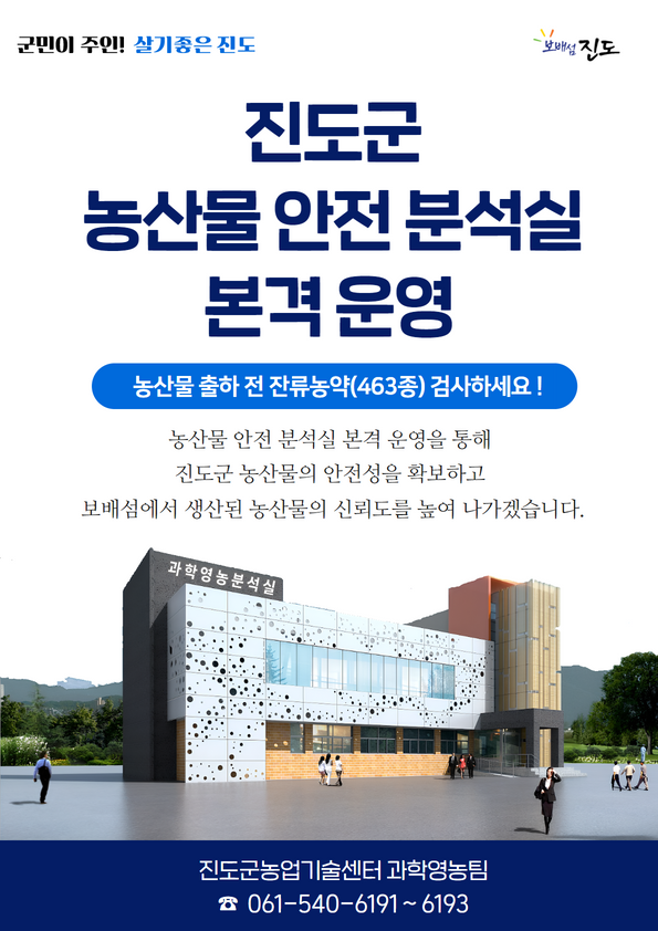 진도군은 농촌진흥청에서 주관하는 농산물안전분석실 운영 공모사업에 최종 선정돼 사업비 24억원을 확보하여 333㎡ 규모로 총 463종의 잔류농약을 분석하는 기체질량분석기, 액체질량분석기 등 23종 39대 분석장비를 완비하였습니다.