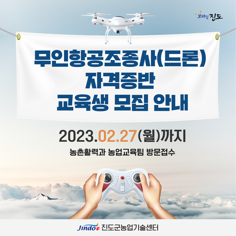농업 기계화 및 인구 고령화에 대비한 무인항공조종사(드론) 자격증 취득으로 스마트 농업인 양성과 농업 혁신 선도 및 경쟁력 확보를 위해 실시하는 진도군 2023년 무인항공조종사(드론) 자격증반 교육생 모집을 다음과 같이 안내드립니다.