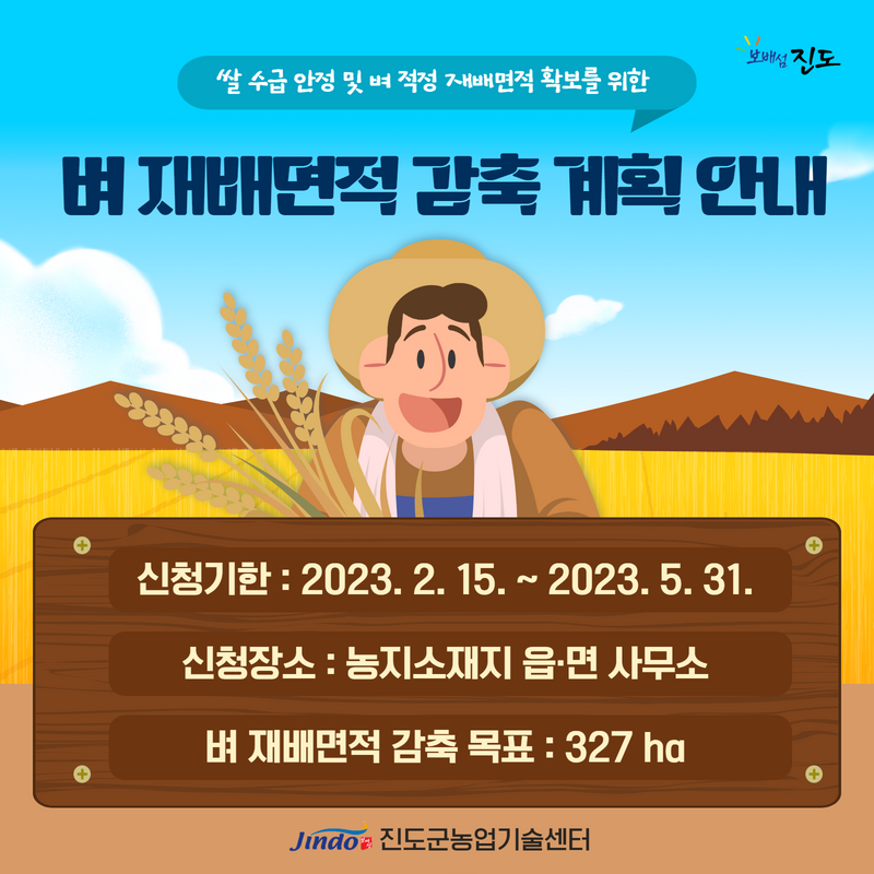 2023년 쌀 수급 안정 및 벼 적정 재배면적 확보를 위한 벼 재배면적 감축 및 인센티브 부여 계획을 다음과 안내드립니다.
